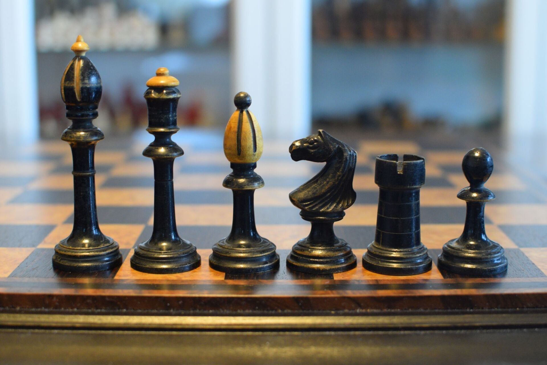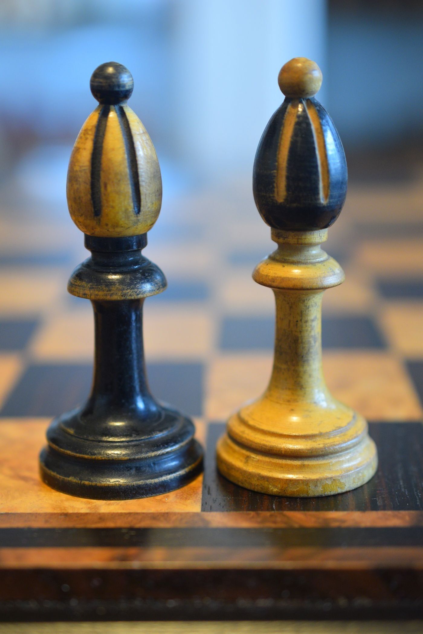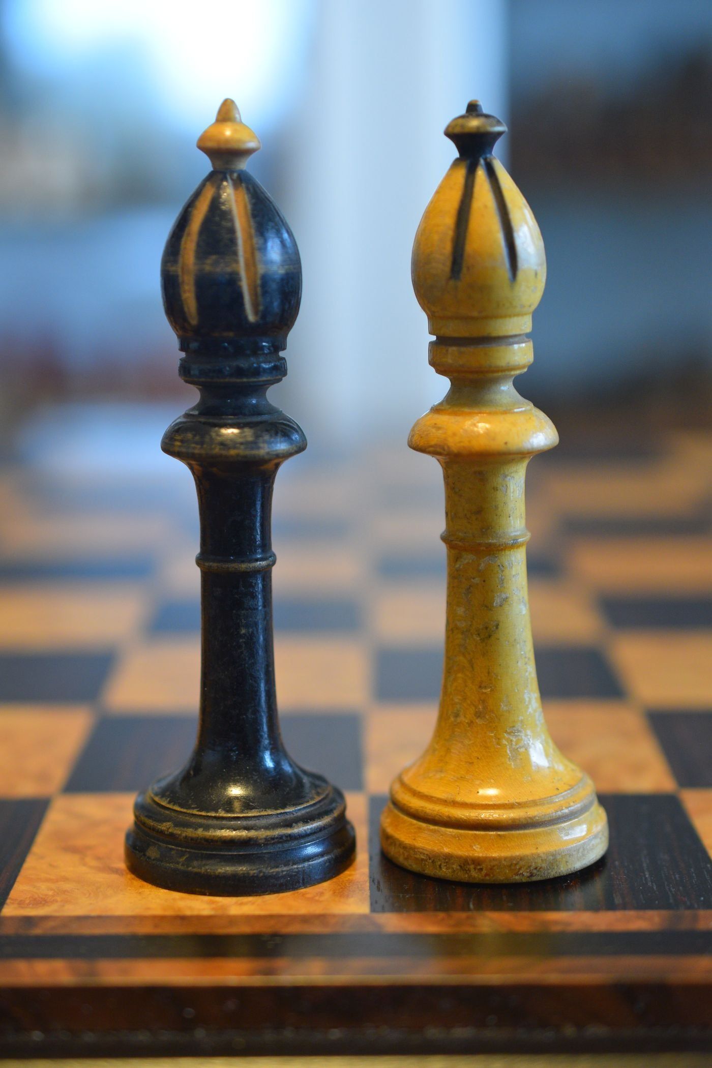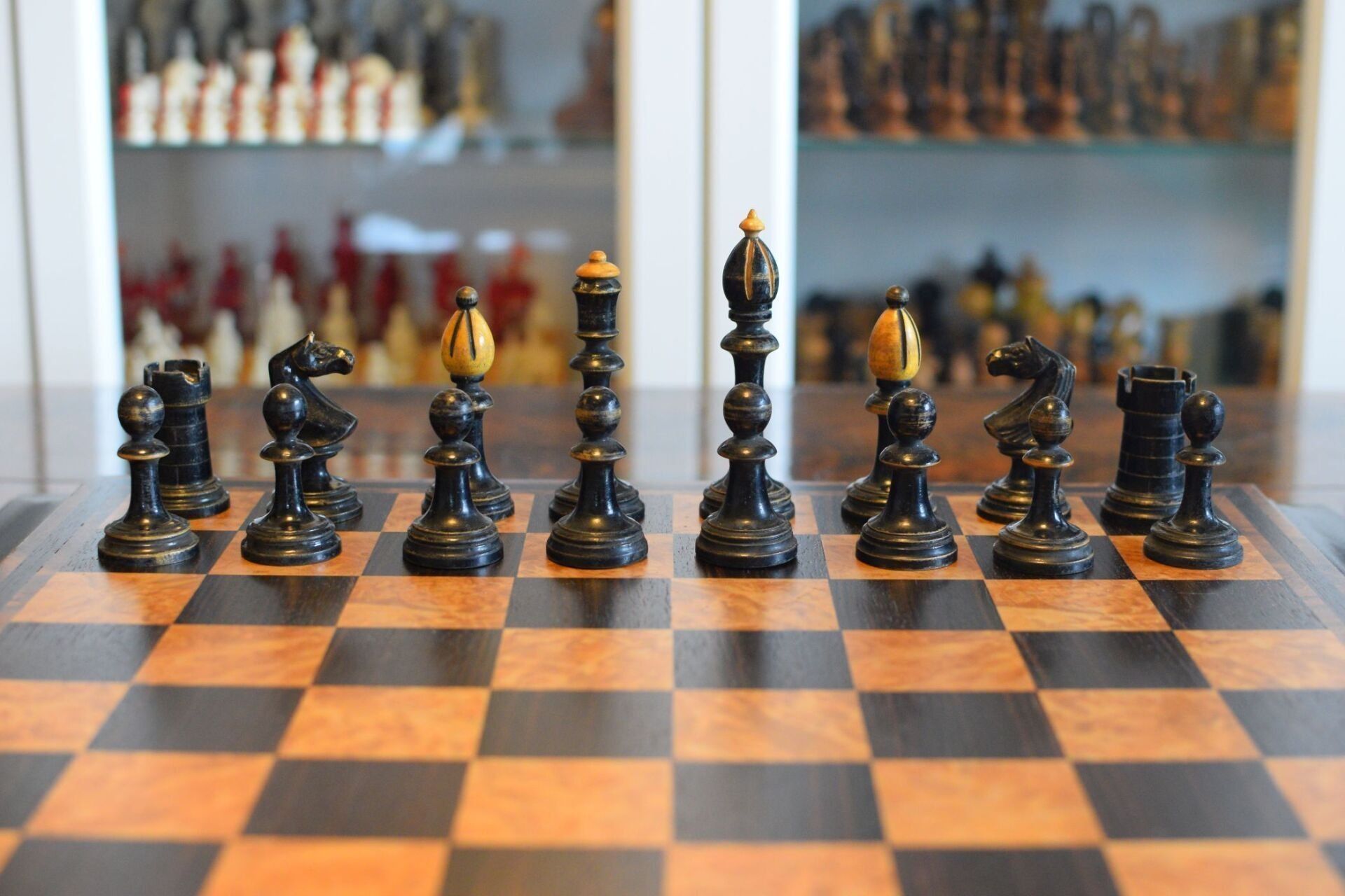 The chess pieces are made of wood, one side lacquered in black. The king height is 98 mm. The pieces are weighted, even though most of the weights fell out and were lost over the decades. A similar set can be seen as exhibit 1 on the ČESKÁ KLUBOVKA website.