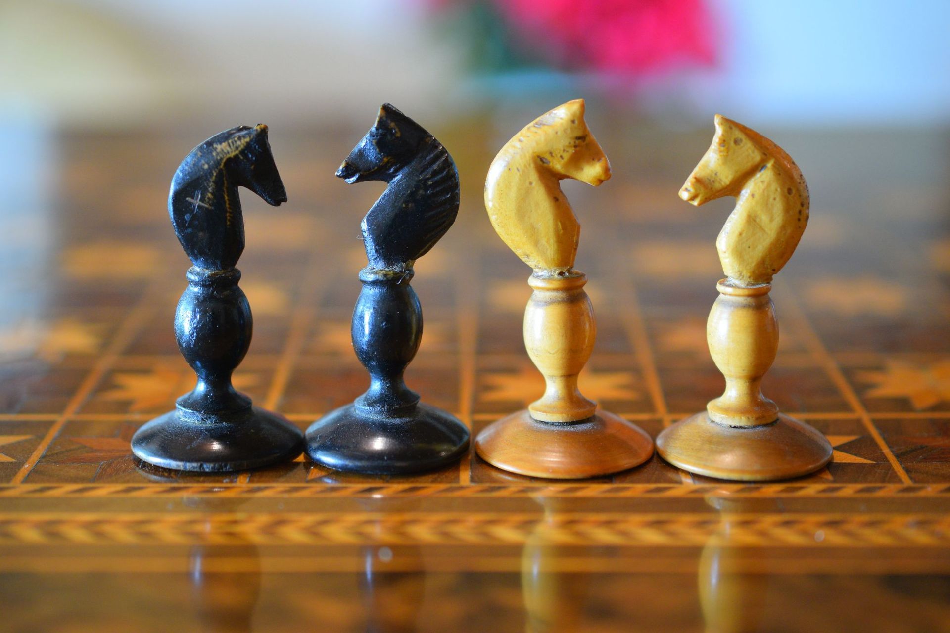 Austrian Coffeehouse Chess Set in the Biedermeier style, made around 1830 from boxwood, one side ebonised, the other left natural. King size is 6.8 - 7.3 cm with the white king being slightly smaller. Kings with double galleries, queens with single galleries. Kings and queens with elongated spherical heads. Knights as horses' heads. Bishops with slanted caps in the opposite colour. Rooks as turrets with alternate coloured ball finials.