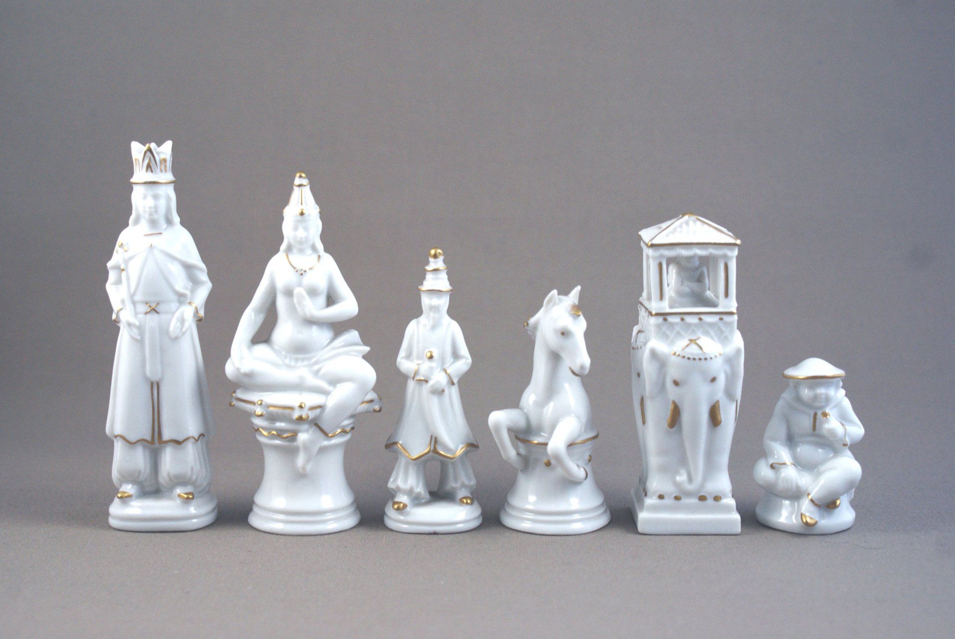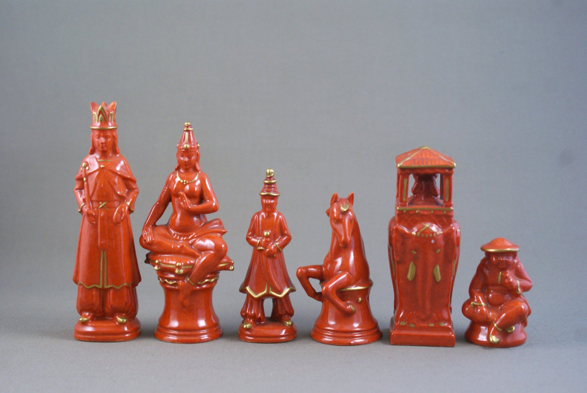 A German porcelain chess set made by Aelteste Volkstedter Porzellanmanufaktur in Rudolstadt/Volkstedt. The design is from the 1920's. One side with a dark orange glaze, the other white, all with gilt highlights. The pieces are inspired by Asian motifs. The kings as rulers wearing a crown and holding a sceptre, the queens with oriental dress sitting on a raised base in lotus position, the bishops as bearded Asian counsellors holding curved scimitars, the knights as rearing horses on a raised base, the rooks as elephants carrying a pagoda with a mahout inside, the pawns in sitting position with chinese hats. King size is 10 cm.