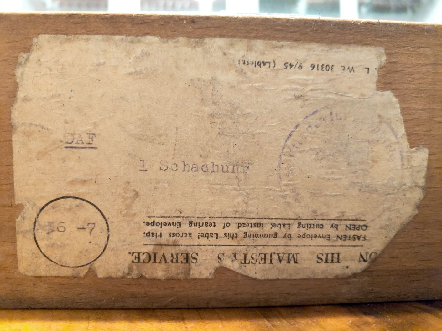 On the underside of the base are the remains of a label or a stamped envelope with imprints partly in English and partly in German language. In German it reads "1 Schachuhr", which means "one chess clock". In English, the words "On His Majesty's Service" are printed, which is an official franking commonly seen on correspondence from government departments in the United Kingdom, Canada, Australia and other countries of the Commonwealth.