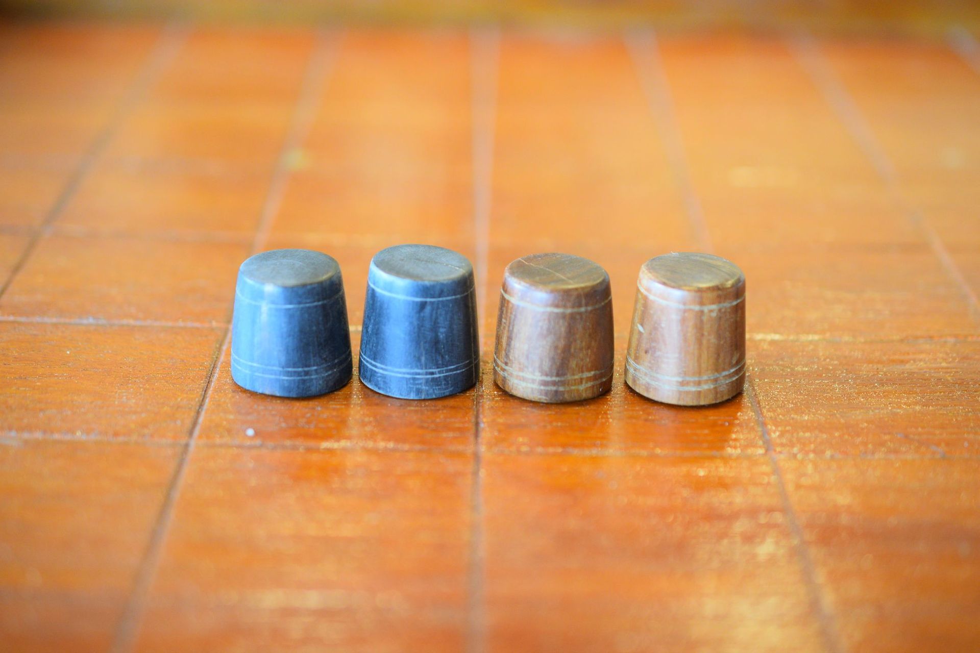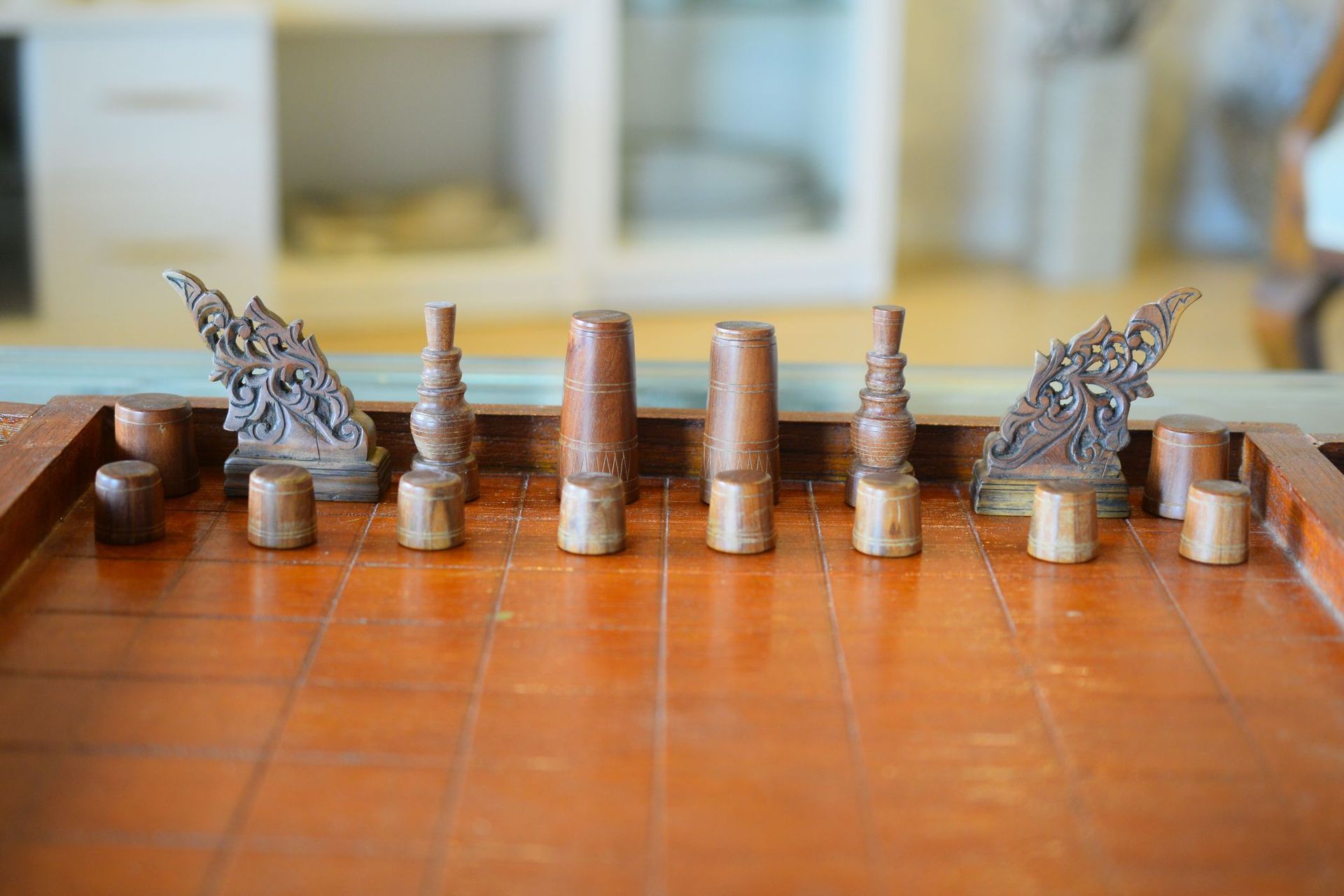 Chessmen with a king size of 6 cm made by the Bangsamoro (or Moro) people in Mindanao, Philippines, likely dating to mid-20th century. The pieces are made of local hardwood and buffalo horn. The centrepieces of every Moro chess set are undoubtedly the knights with their exotic ornamentation, which are particularly distinctive and attractive in this set. For more information on Moro chess sets, see my article