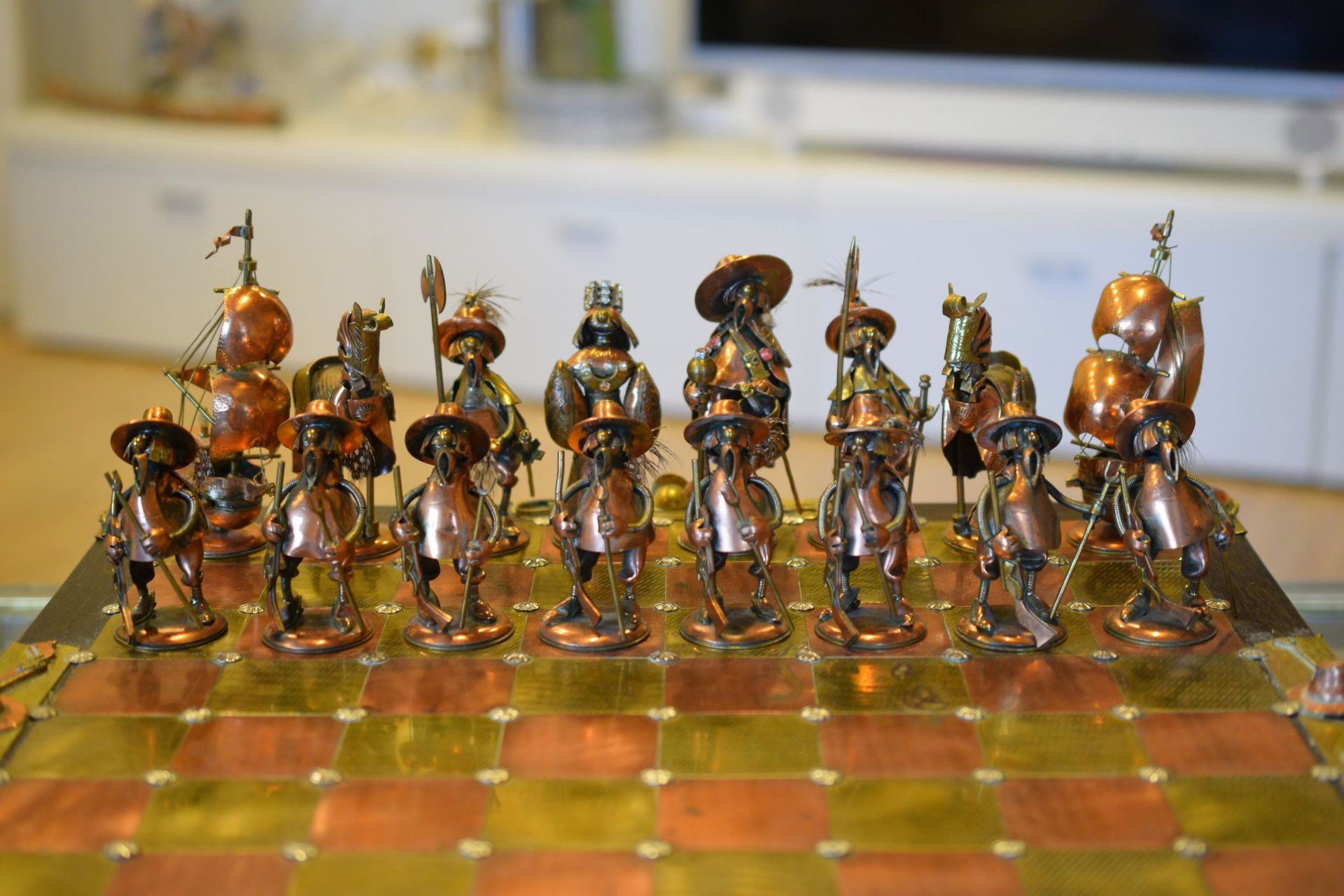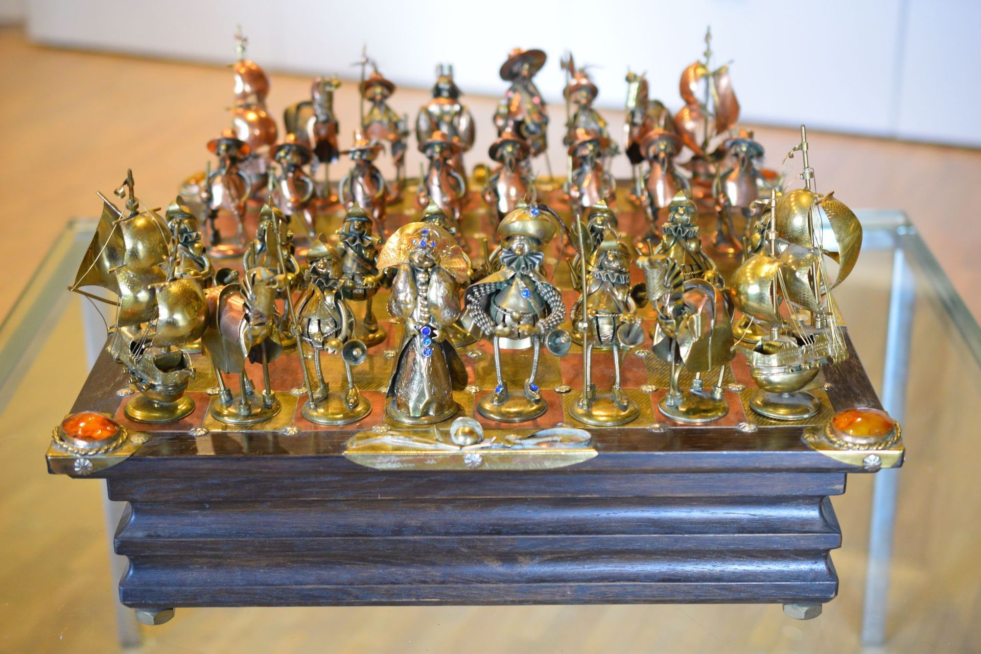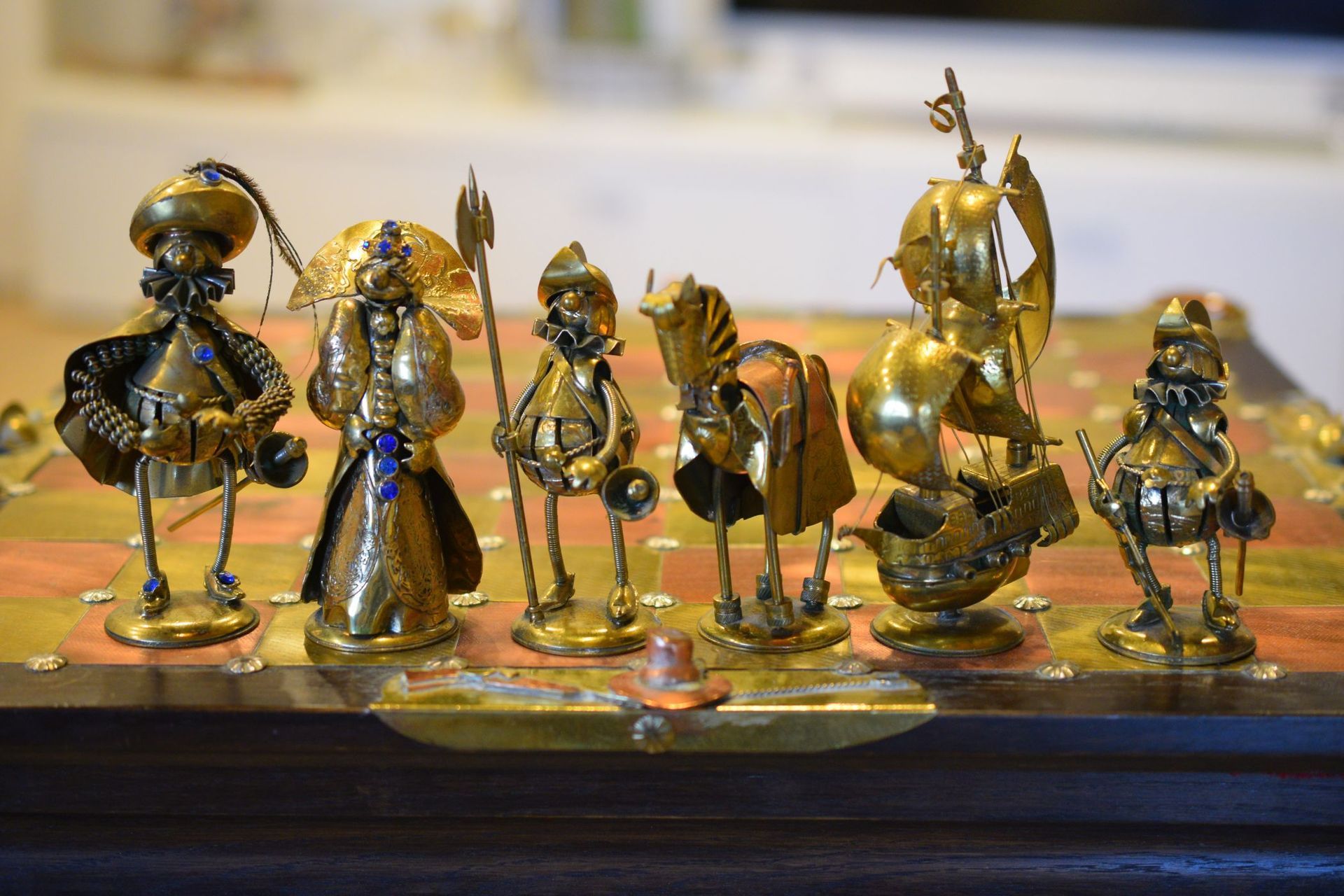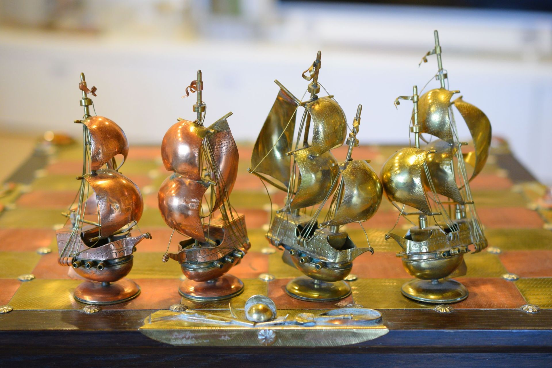 I was lucky enough to get hold of one of these rare caricature like chess sets made by Magda and Andrzej Nowakowscy from Warsaw, Poland. It is a so called "Armada Set", the design of which was probably inspired by the destruction of the Spanish Armada by the English in 1588. The pieces were cut from brass and copper sheet and then soldered with decorations including coloured stones and real bird feathers. The kings are 10cm, the pawns 8.6cm. The brass side represents the Spanish Armada, with the king and queen in opulent costume, Spanish galleys as rooks and pawns with morrión helmets. The copper side represents the English fleet with frigates as rooks. The bishops on both sides are designed as soldiers with halberds and rapiers. The attention to detail is amazing. The ships used as rooks, for example, have inflated sails, ropes and little cannons on both sides, the helmets of the pawns are decorated with real bird feathers etc. The set came with its original board box with brass and copper squares, amber decorations on each corner, red velvet interior felting to protect the pieces and a crest shaped metal sign on the inside of the lid with the makers' names. Also, the bottom of each piece is engraved with the names of Magda and Andrzej Nowakowscy.
