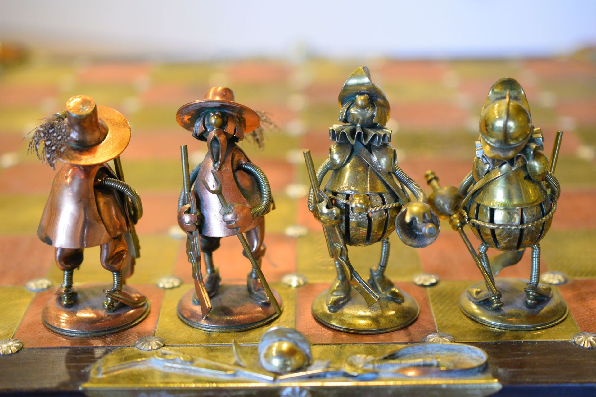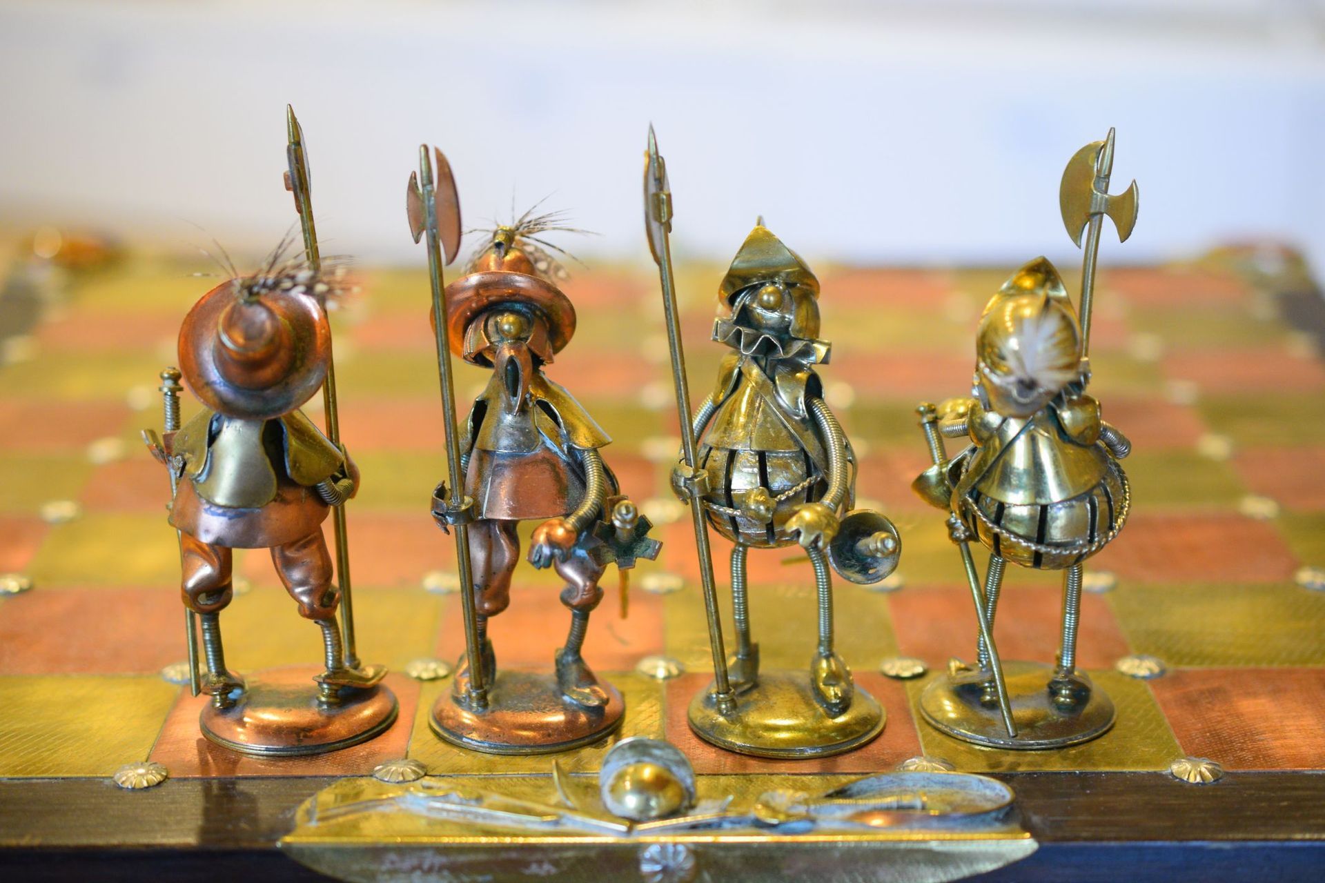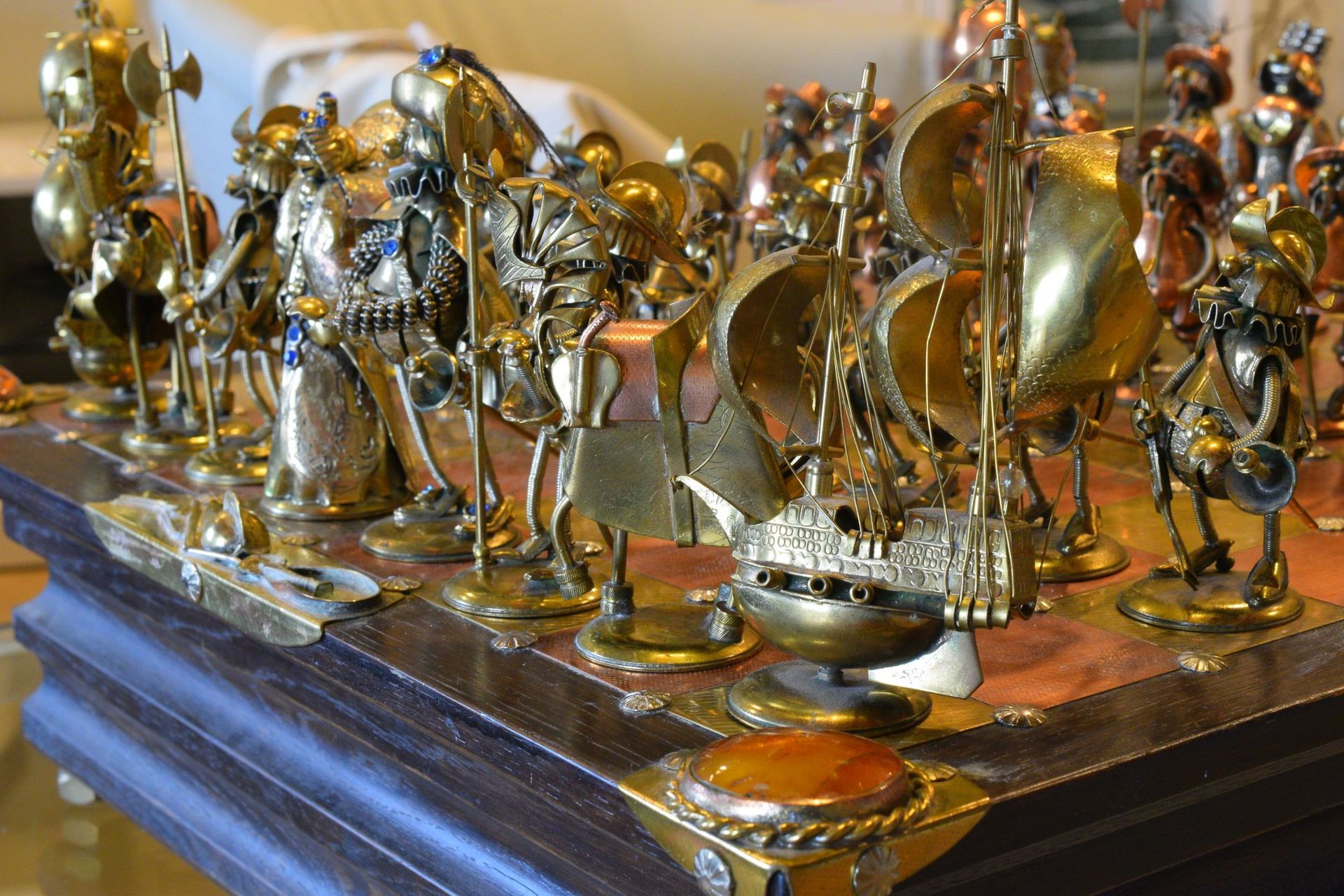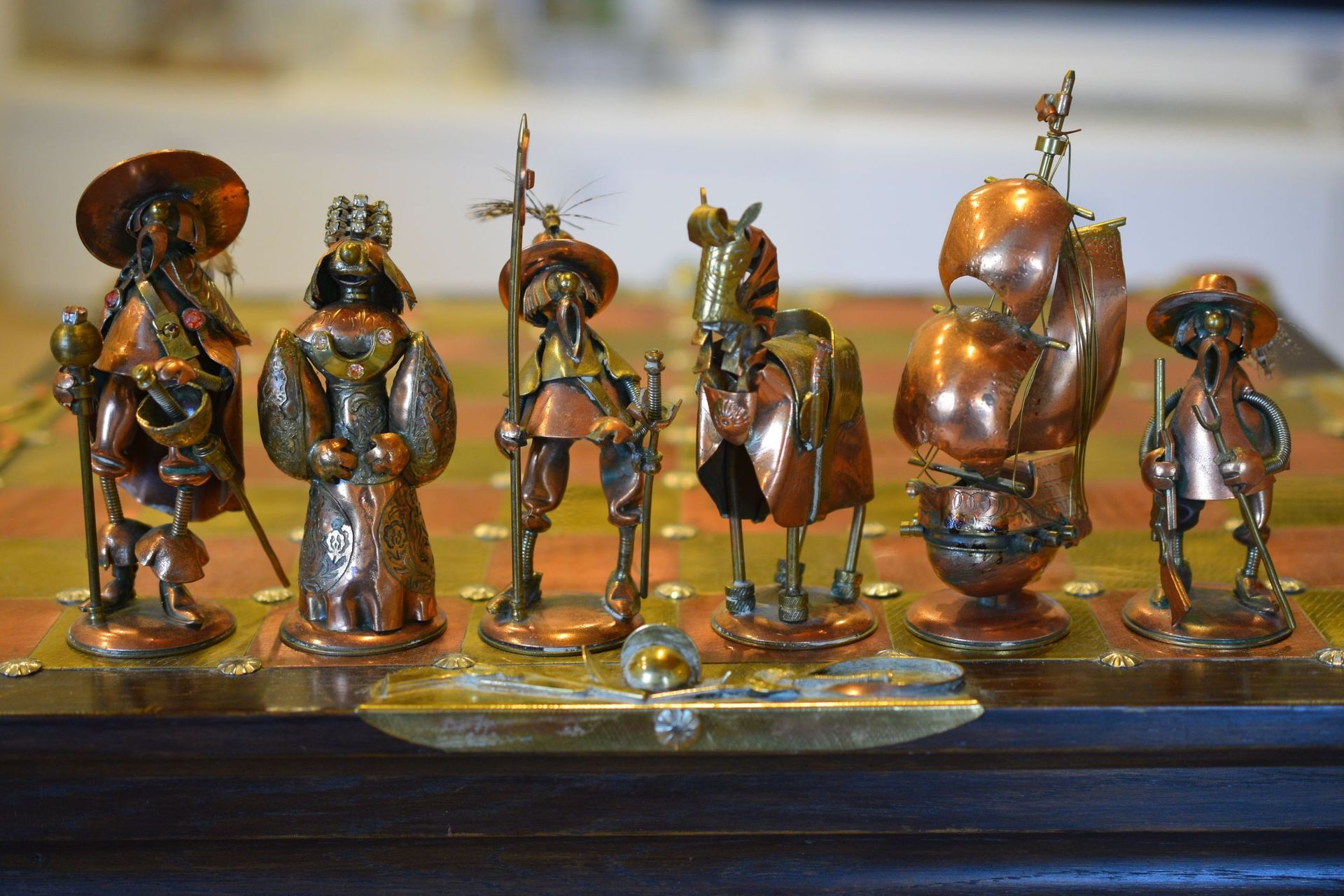 I was lucky enough to get hold of one of these rare caricature like chess sets made by Magda and Andrzej Nowakowscy from Warsaw, Poland. It is a so called "Armada Set", the design of which was probably inspired by the destruction of the Spanish Armada by the English in 1588. The pieces were cut from brass and copper sheet and then soldered with decorations including coloured stones and real bird feathers. The kings are 10cm, the pawns 8.6cm. The brass side represents the Spanish Armada, with the king and queen in opulent costume, Spanish galleys as rooks and pawns with morrión helmets. The copper side represents the English fleet with frigates as rooks. The bishops on both sides are designed as soldiers with halberds and rapiers. The attention to detail is amazing. The ships used as rooks, for example, have inflated sails, ropes and little cannons on both sides, the helmets of the pawns are decorated with real bird feathers etc. The set came with its original board box with brass and copper squares, amber decorations on each corner, red velvet interior felting to protect the pieces and a crest shaped metal sign on the inside of the lid with the makers' names. Also, the bottom of each piece is engraved with the names of Magda and Andrzej Nowakowscy.
