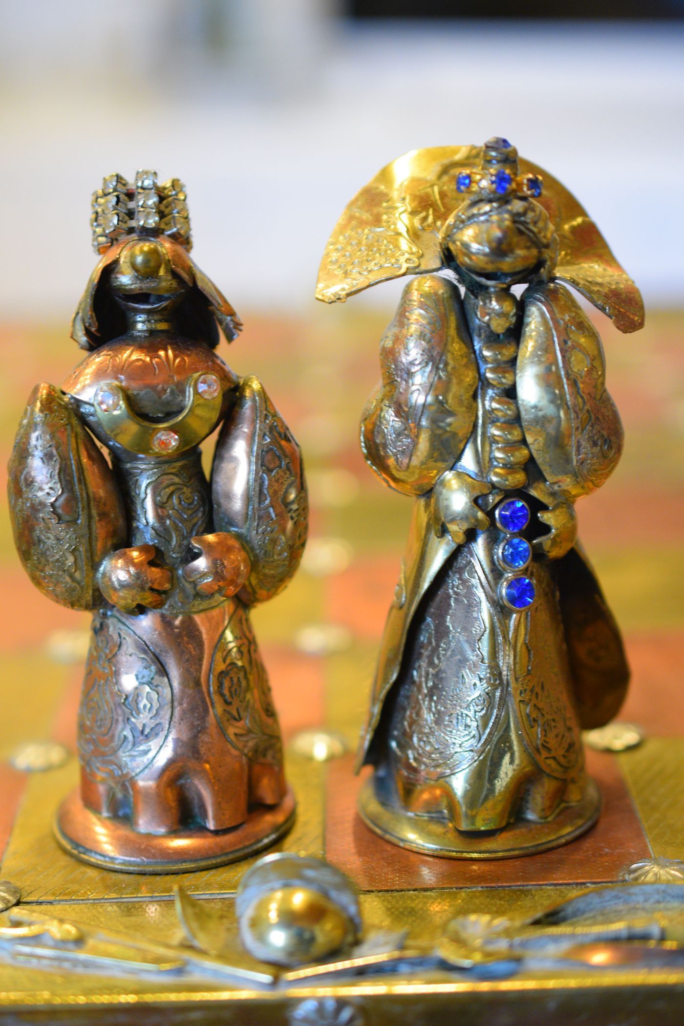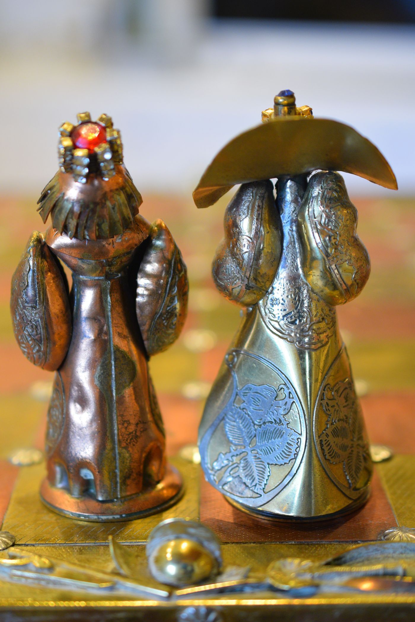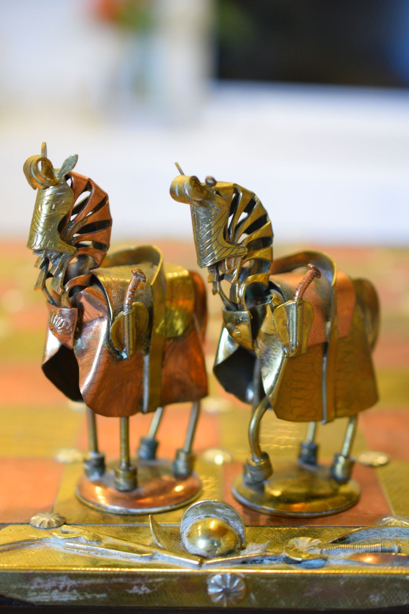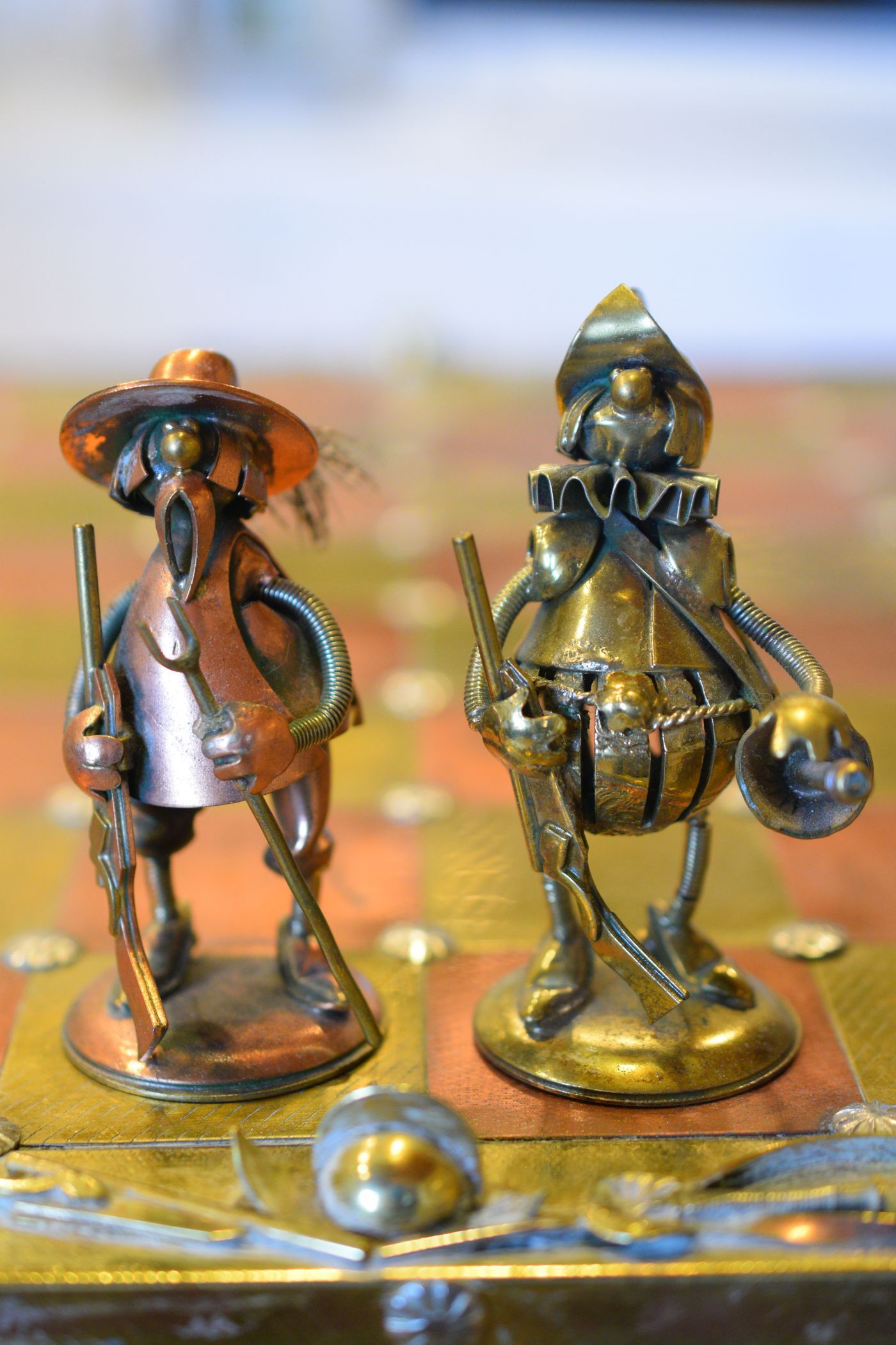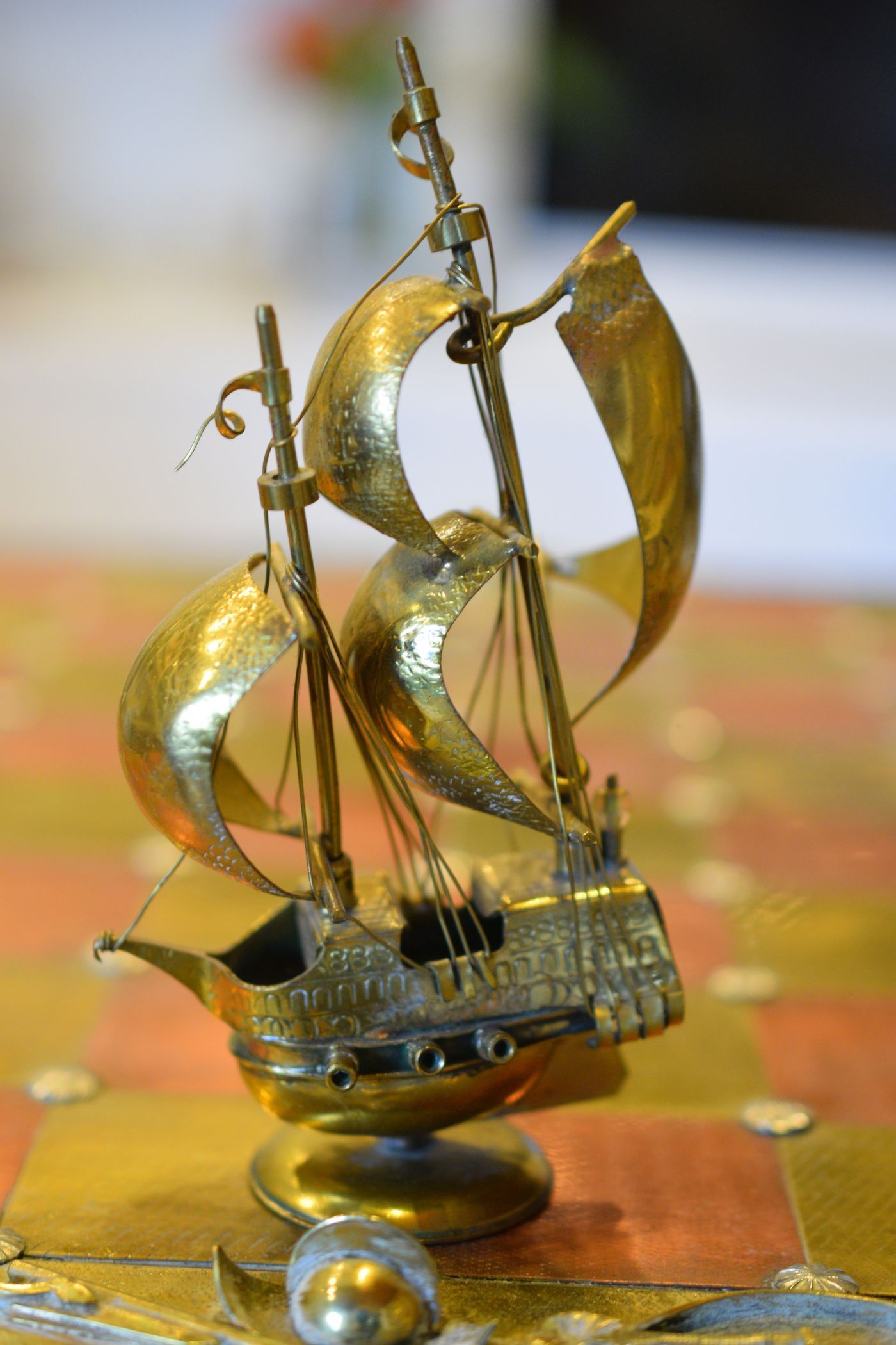 I was lucky enough to get hold of one of these rare caricature like chess sets made by Magda and Andrzej Nowakowscy from Warsaw, Poland. It is a so called "Armada Set", the design of which was probably inspired by the destruction of the Spanish Armada by the English in 1588. The pieces were cut from brass and copper sheet and then soldered with decorations including coloured stones and real bird feathers. The kings are 10cm, the pawns 8.6cm. The brass side represents the Spanish Armada, with the king and queen in opulent costume, Spanish galleys as rooks and pawns with morrión helmets. The copper side represents the English fleet with frigates as rooks. The bishops on both sides are designed as soldiers with halberds and rapiers. The attention to detail is amazing. The ships used as rooks, for example, have inflated sails, ropes and little cannons on both sides, the helmets of the pawns are decorated with real bird feathers etc. The set came with its original board box with brass and copper squares, amber decorations on each corner, red velvet interior felting to protect the pieces and a crest shaped metal sign on the inside of the lid with the makers' names. Also, the bottom of each piece is engraved with the names of Magda and Andrzej Nowakowscy.