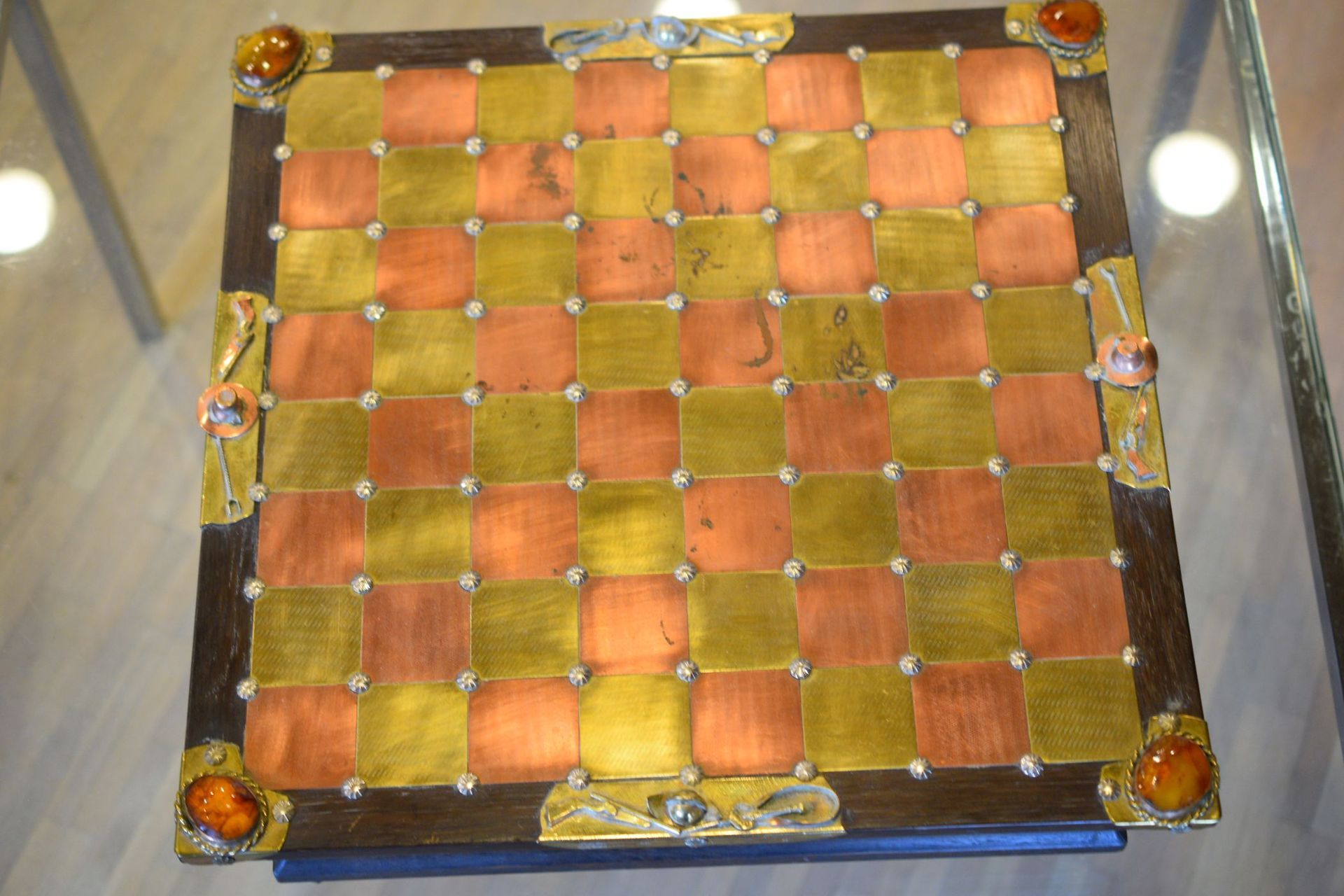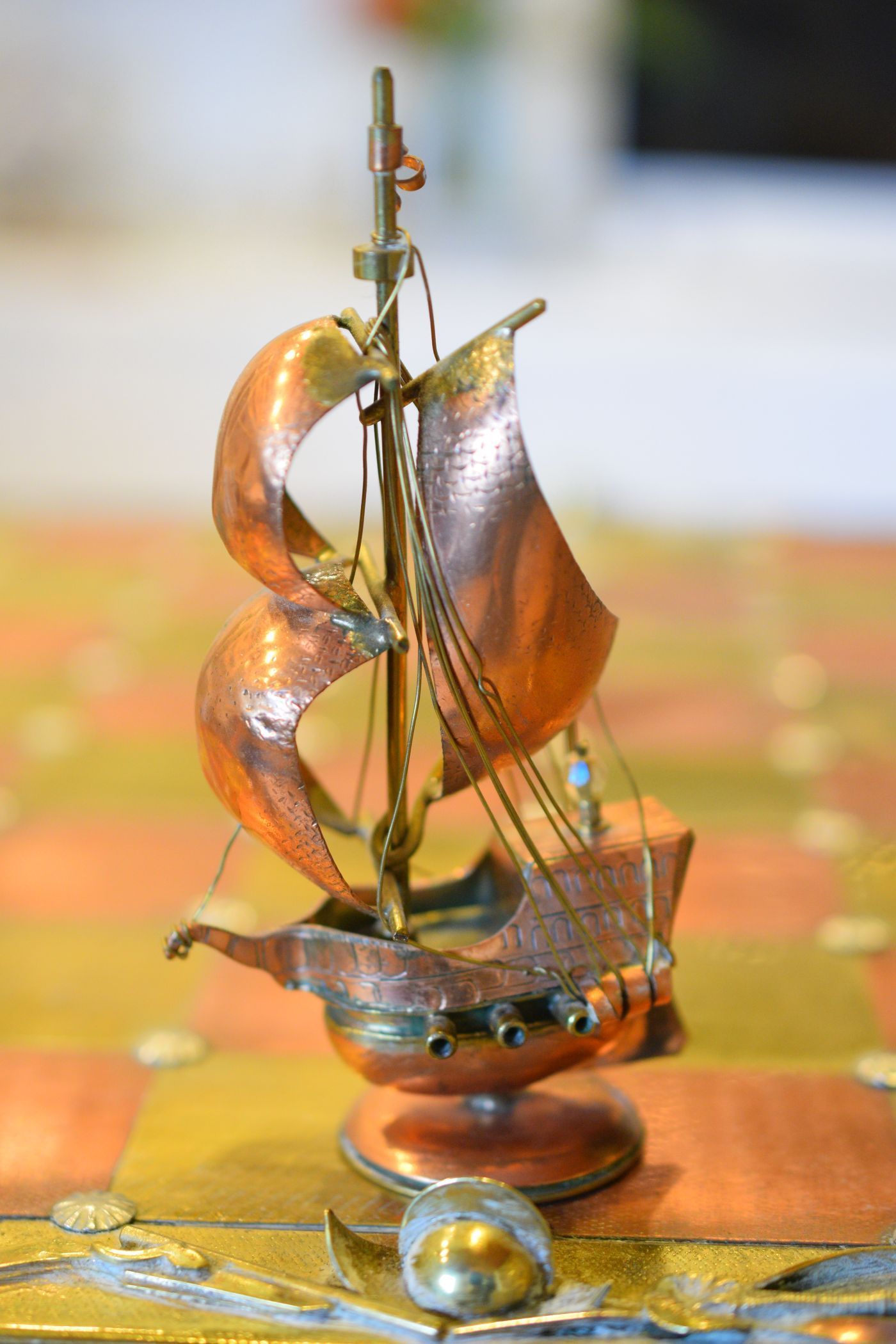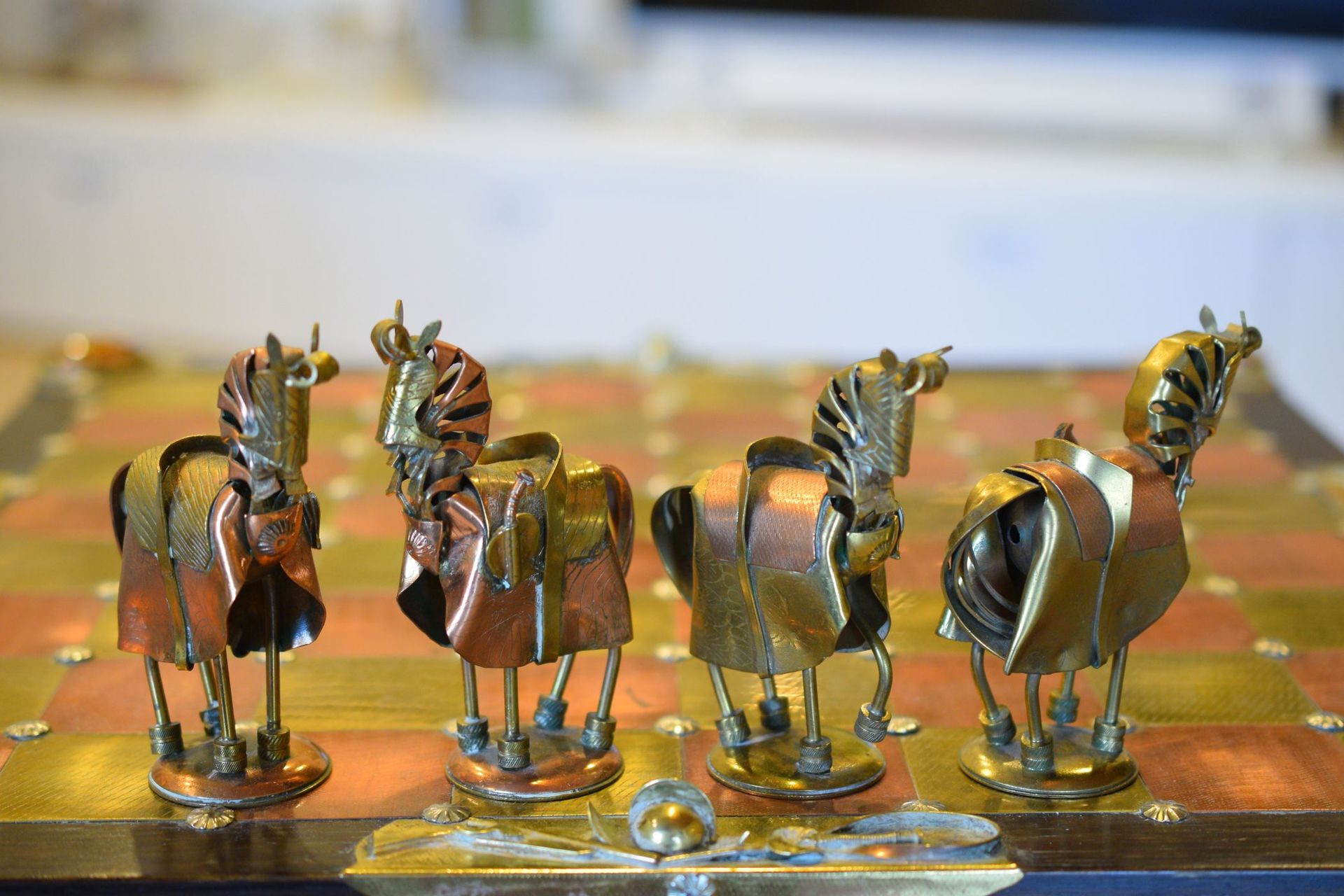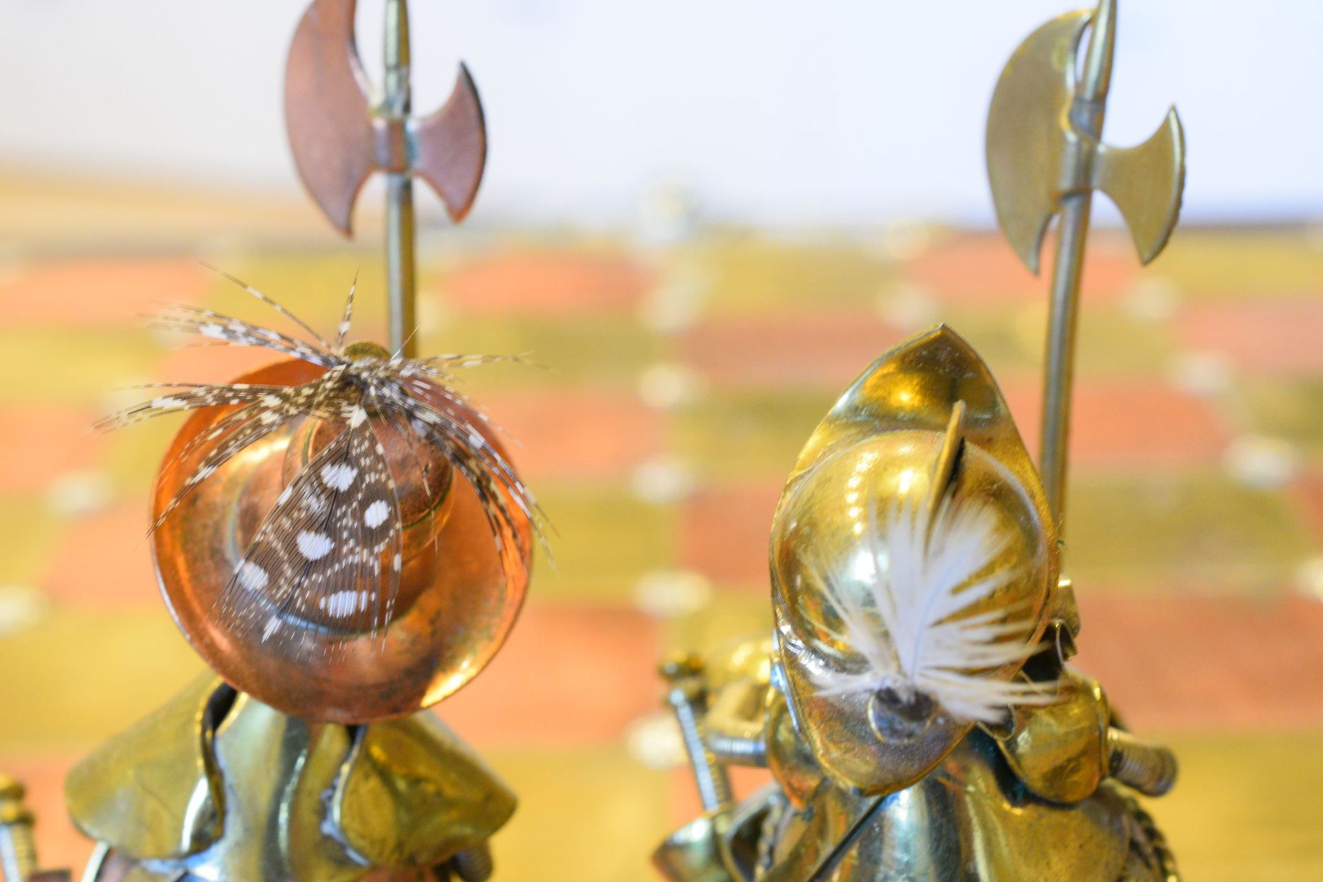 I was lucky enough to get hold of one of these rare caricature like chess sets made by Magda and Andrzej Nowakowscy from Warsaw, Poland. It is a so called "Armada Set", the design of which was probably inspired by the destruction of the Spanish Armada by the English in 1588. The pieces were cut from brass and copper sheet and then soldered with decorations including coloured stones and real bird feathers. The kings are 10cm, the pawns 8.6cm. The brass side represents the Spanish Armada, with the king and queen in opulent costume, Spanish galleys as rooks and pawns with morrión helmets. The copper side represents the English fleet with frigates as rooks. The bishops on both sides are designed as soldiers with halberds and rapiers. The attention to detail is amazing. The ships used as rooks, for example, have inflated sails, ropes and little cannons on both sides, the helmets of the pawns are decorated with real bird feathers etc. The set came with its original board box with brass and copper squares, amber decorations on each corner, red velvet interior felting to protect the pieces and a crest shaped metal sign on the inside of the lid with the makers' names. Also, the bottom of each piece is engraved with the names of Magda and Andrzej Nowakowscy.