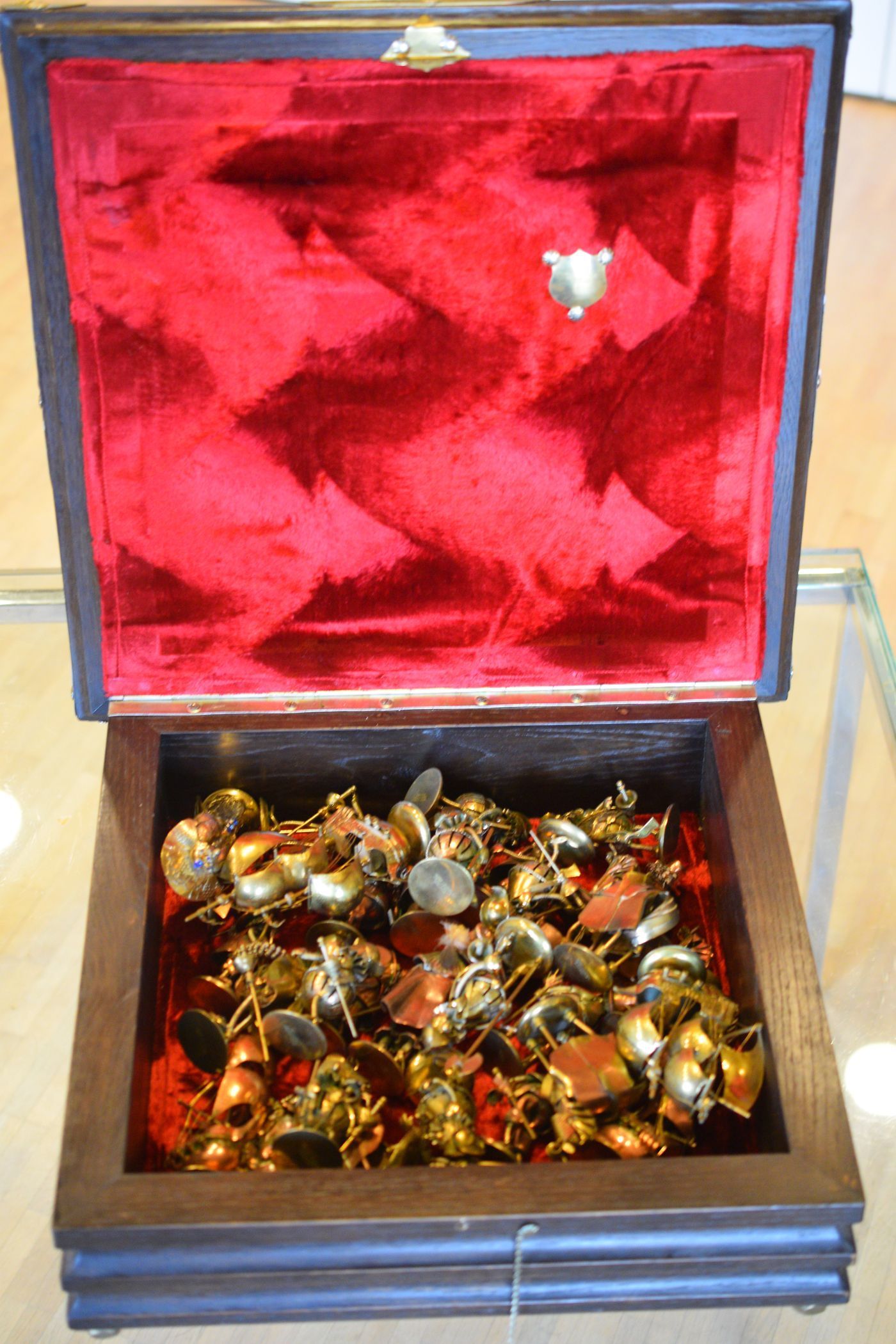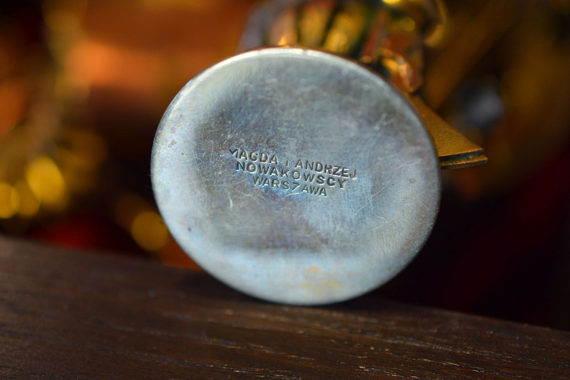 The artistic value of these small sculptures, in which the artist reflected human life, sometimes grotesquely and amusingly, was noticed in 1966 by Prof. Adam Jabłoński, chairman of the ORNO Cooperative of Artistic Handiwork, a Polish mid-century cooperative of artists located in Warsaw. At ORNO Andrzej Nowakowscy worked for five years, learning the techniques and professional secrets of a metalwork artist. Already in 1967 he obtained a professional diploma in the goldsmith trade. In 1971 he married Magda Strzelecka. Together, they opened a goldsmith workshop in 1973, which became famous for its unique metal-plastic products. In a very short time he became known beyond the Polish borders and received commissions from all over the world, especially Japan. During his lifetime, Nowakowscy received many awards, including Poland's Silver Cross of Merit. He died in Warsaw in 2008.