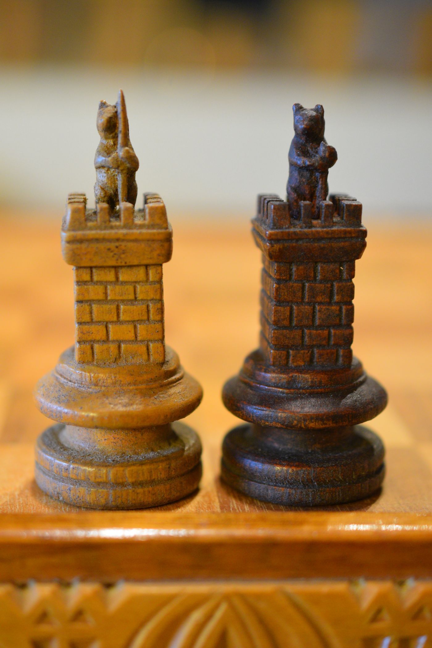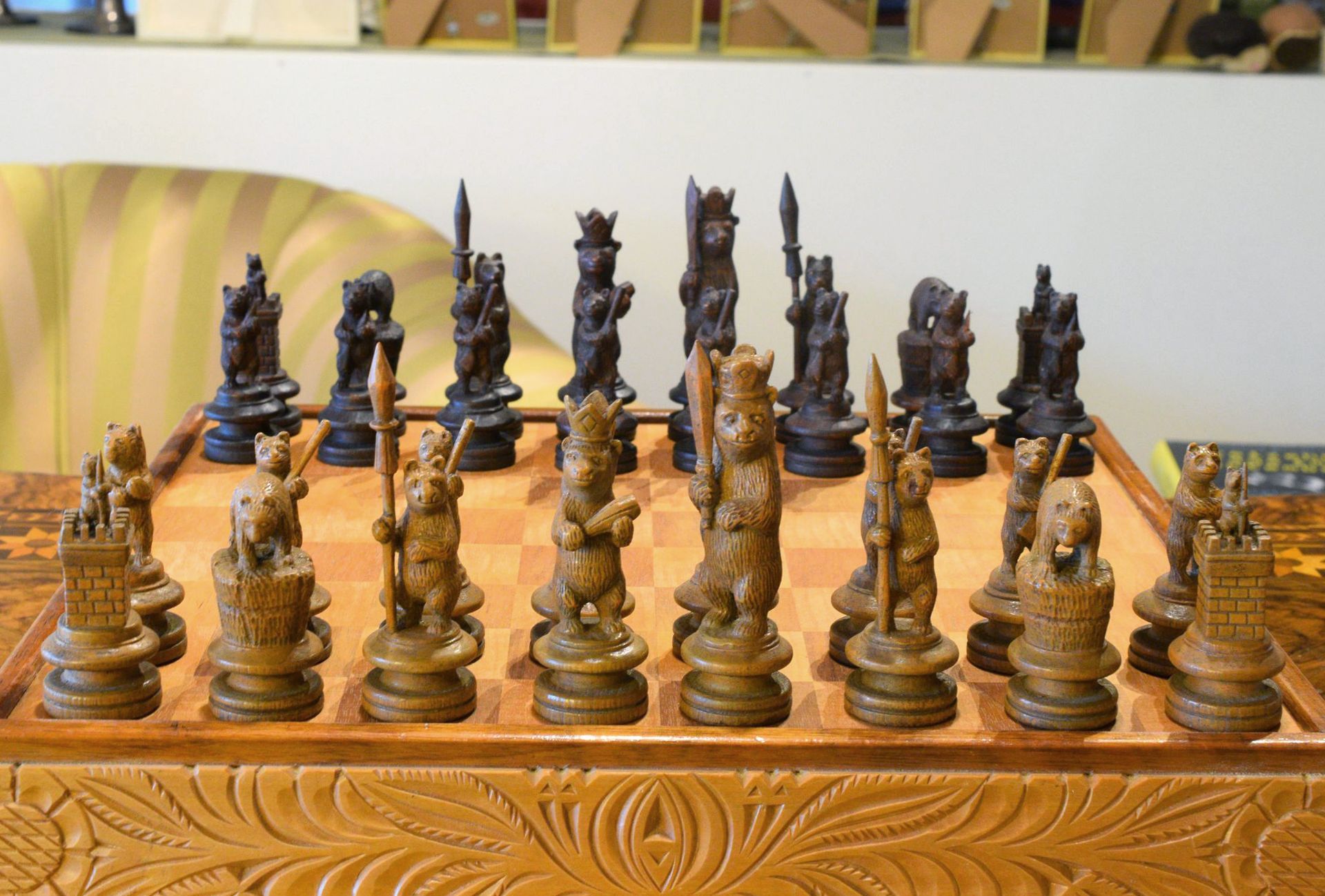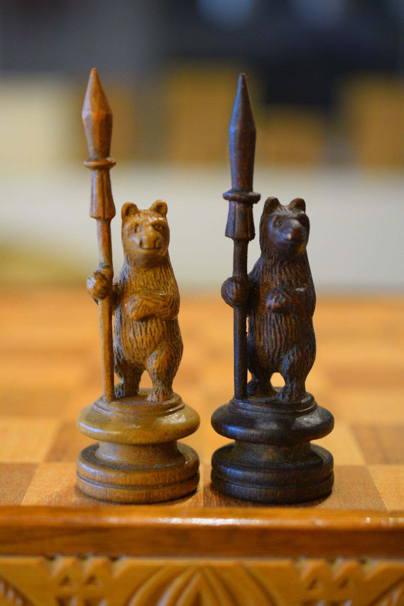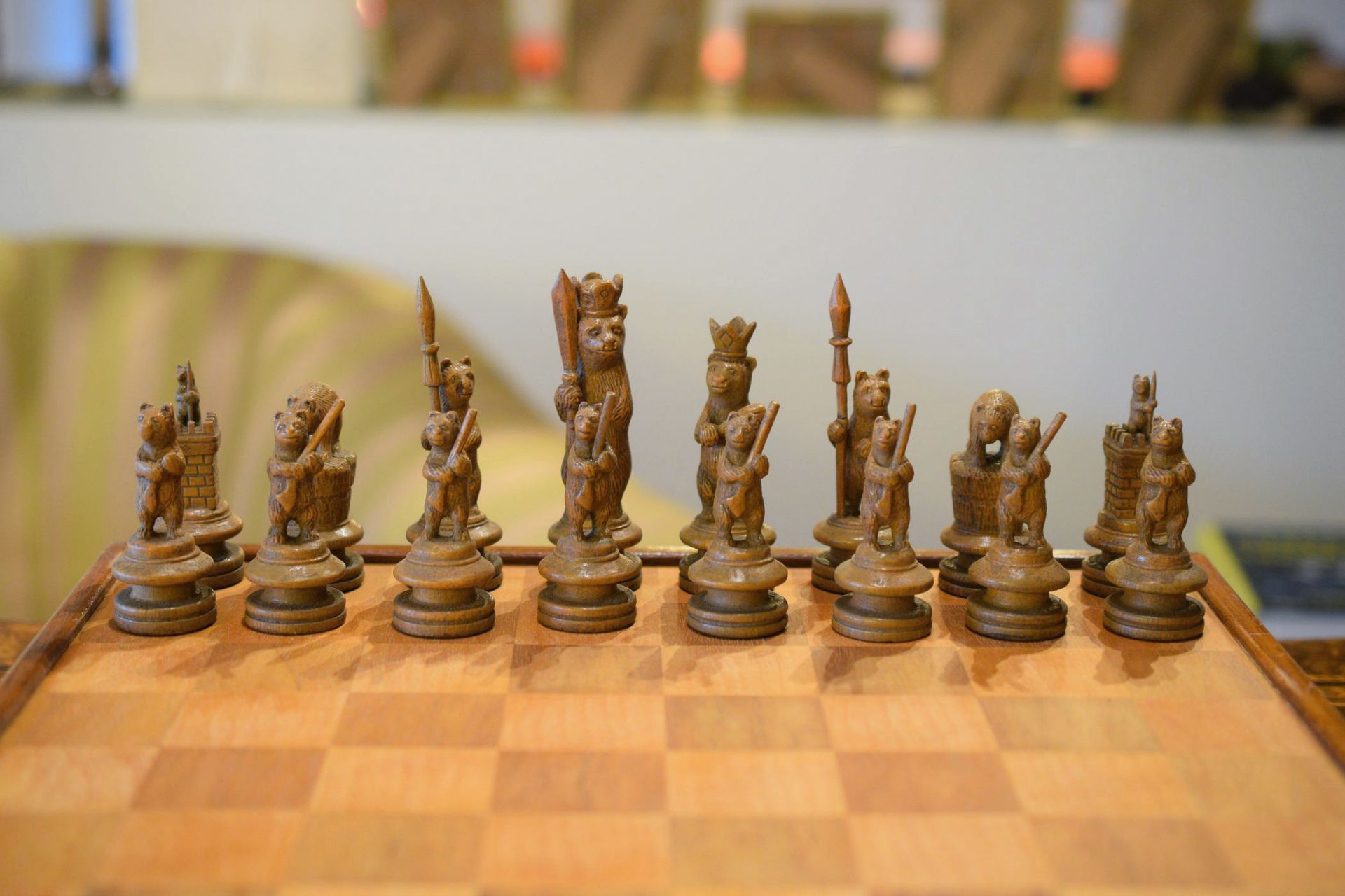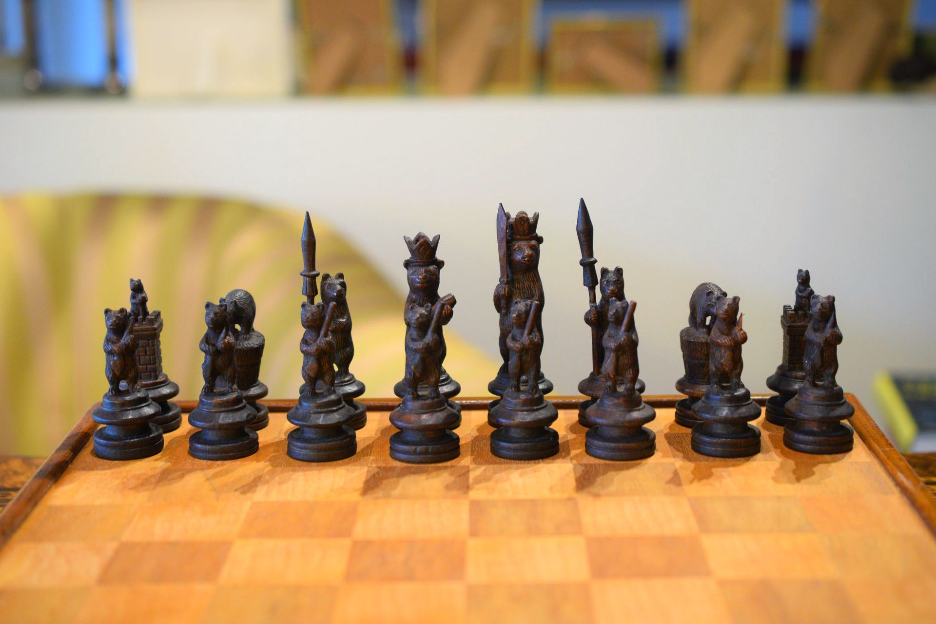 One of my rarest and most valuable chess sets, a so-called ‘Bears of Berne’ chess set from Switzerland, which was made at the end of the 19th century. The pieces with a king size of 10 cm are carved from fruitwood, one side natural, the other side coloured dark brown. The kings wearing a crown and holding a sword. The queens wearing a crown and holding a club. The rooks as turrets surmounted with small bears, the knights as bears on all four paws, the bishops as bears holding spears and the pawns as bears armed with rifles.