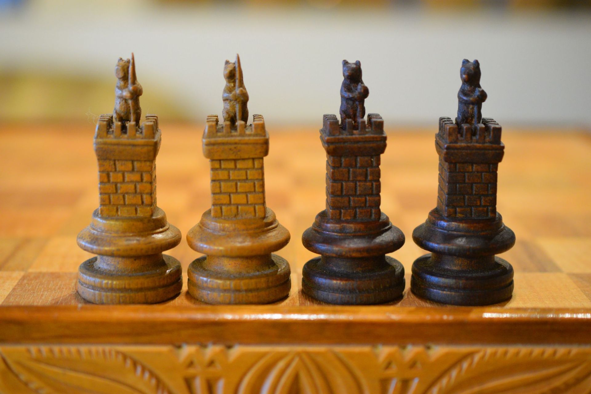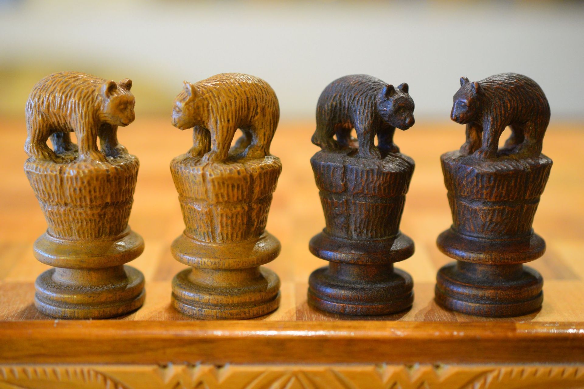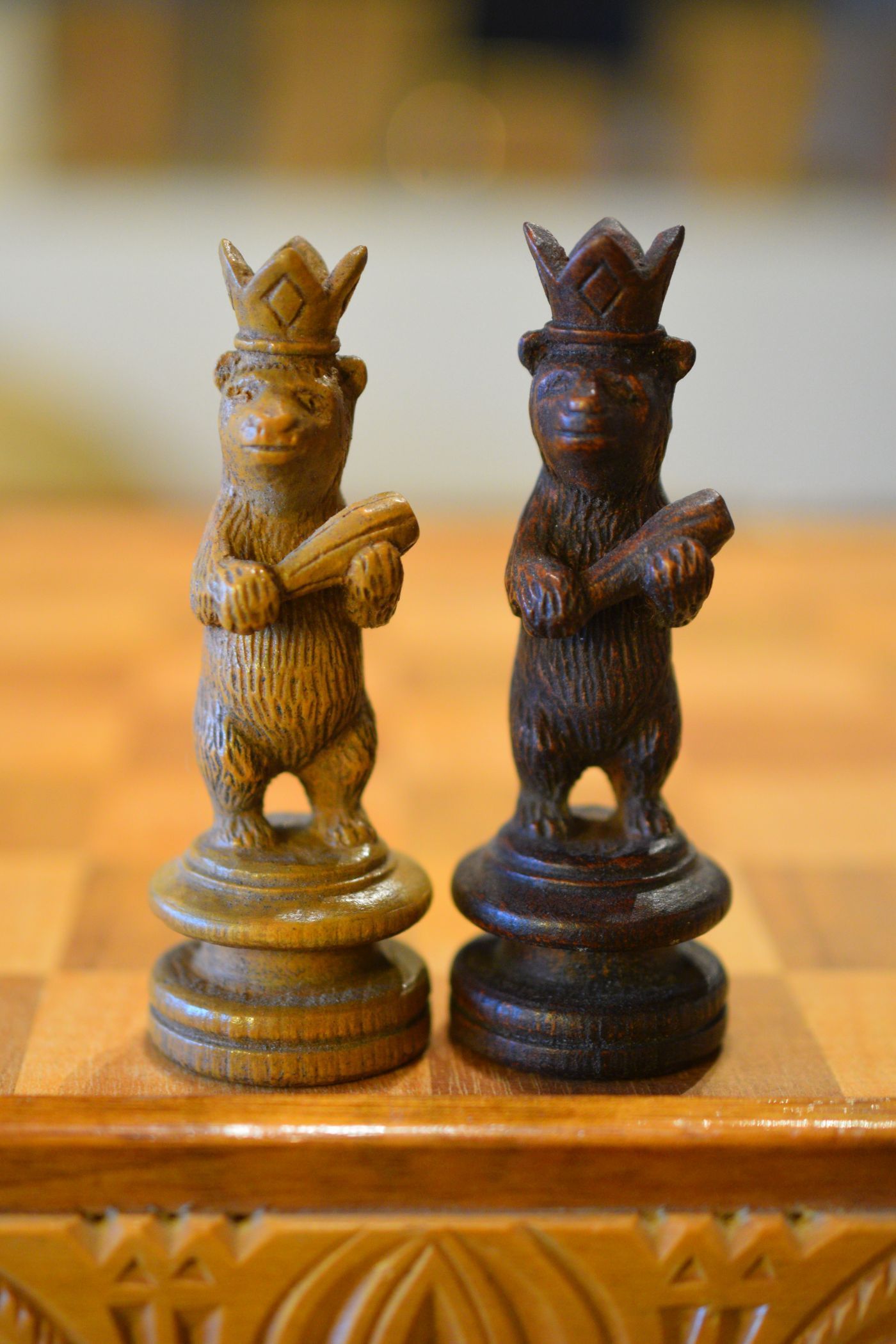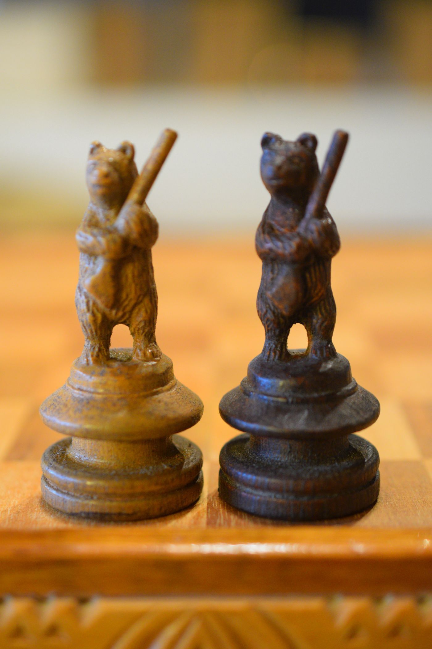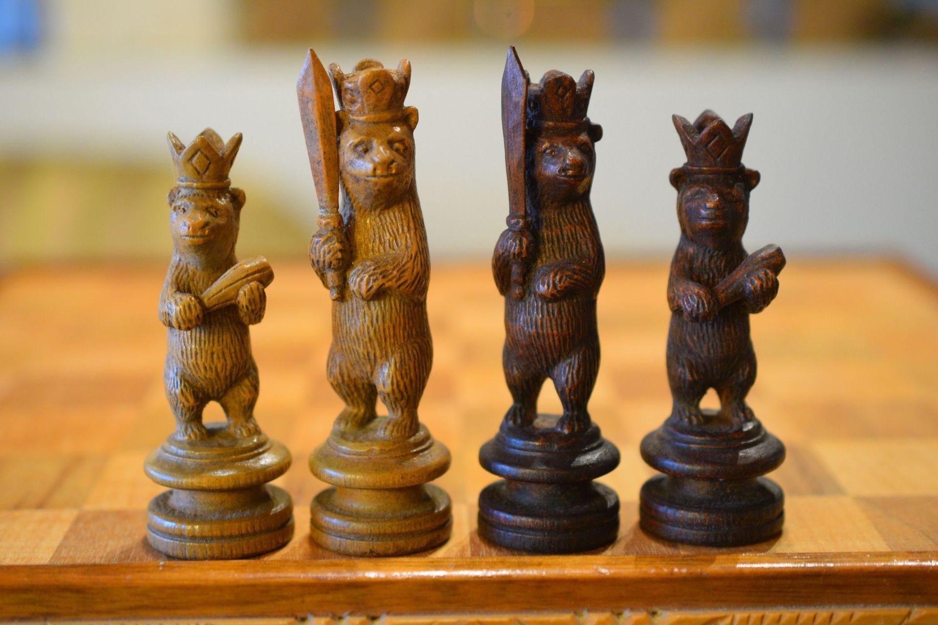 One of my rarest and most valuable chess sets, a so-called ‘Bears of Berne’ chess set from Switzerland, which was made at the end of the 19th century. The pieces with a king size of 10 cm are carved from fruitwood, one side natural, the other side coloured dark brown. The kings wearing a crown and holding a sword. The queens wearing a crown and holding a club. The rooks as turrets surmounted with small bears, the knights as bears on all four paws, the bishops as bears holding spears and the pawns as bears armed with rifles.