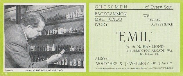 The book was written Alex Hammond, who was both, a chess collector and a chess dealer, who had a shop in Burlington Arcade on Bond Street in the very heart of London during the 1940's and 1950's. Among his close friends were not only the renowned historian Harold J.R. Murray (author of "The History of Chess", first published in 1913, to whom the book is dedicated), but many wealthy collectors including Gustavus Pfeiffer and Jean Manoury. Many collectors from overseas came for a visit to get some expertise or to buy some of the chess sets he offered.