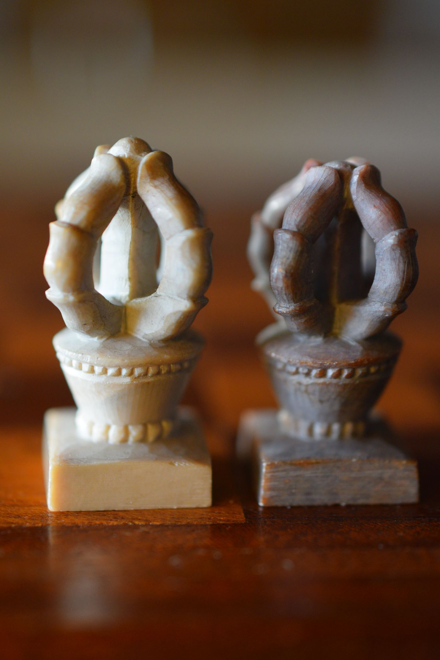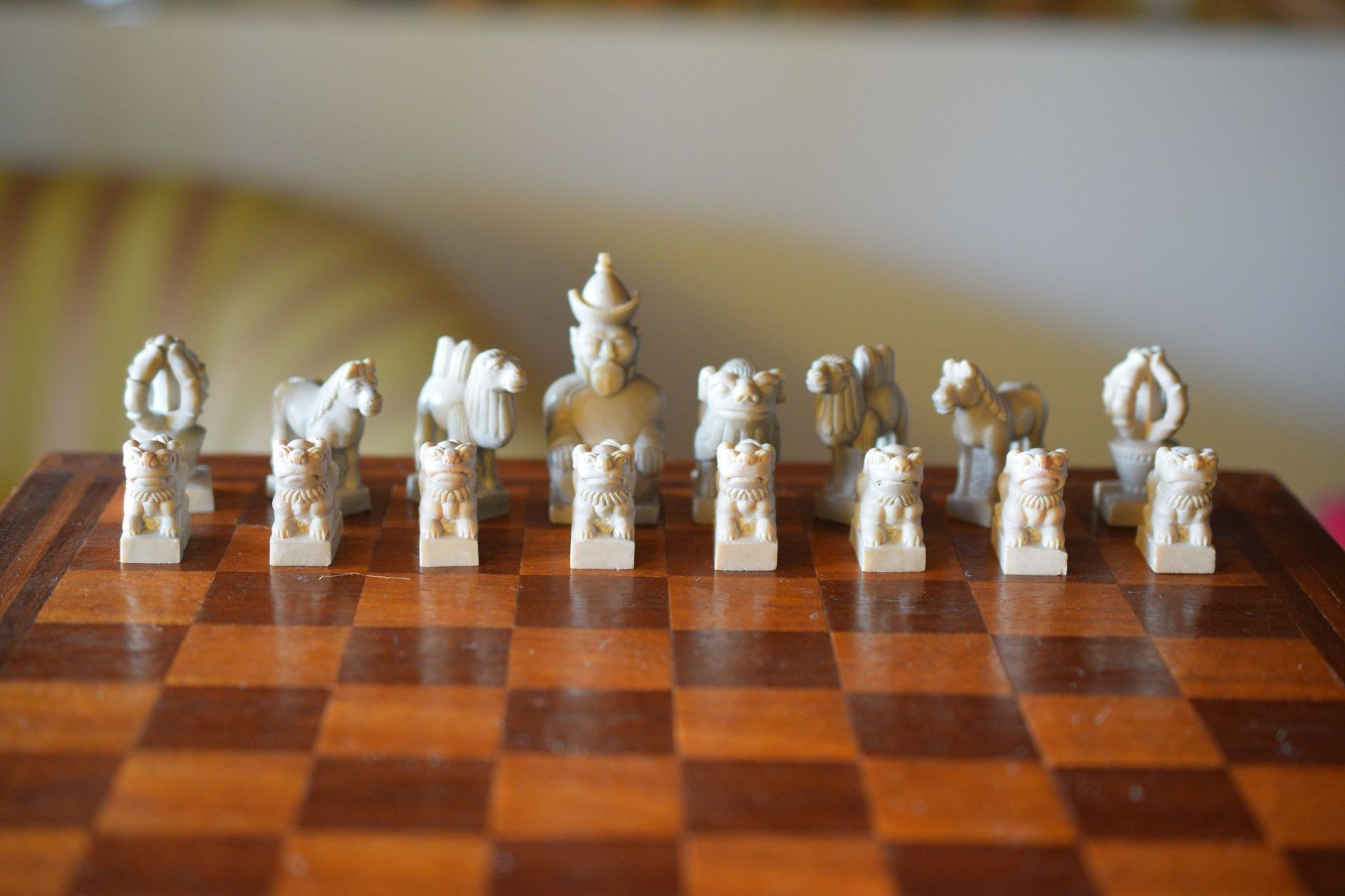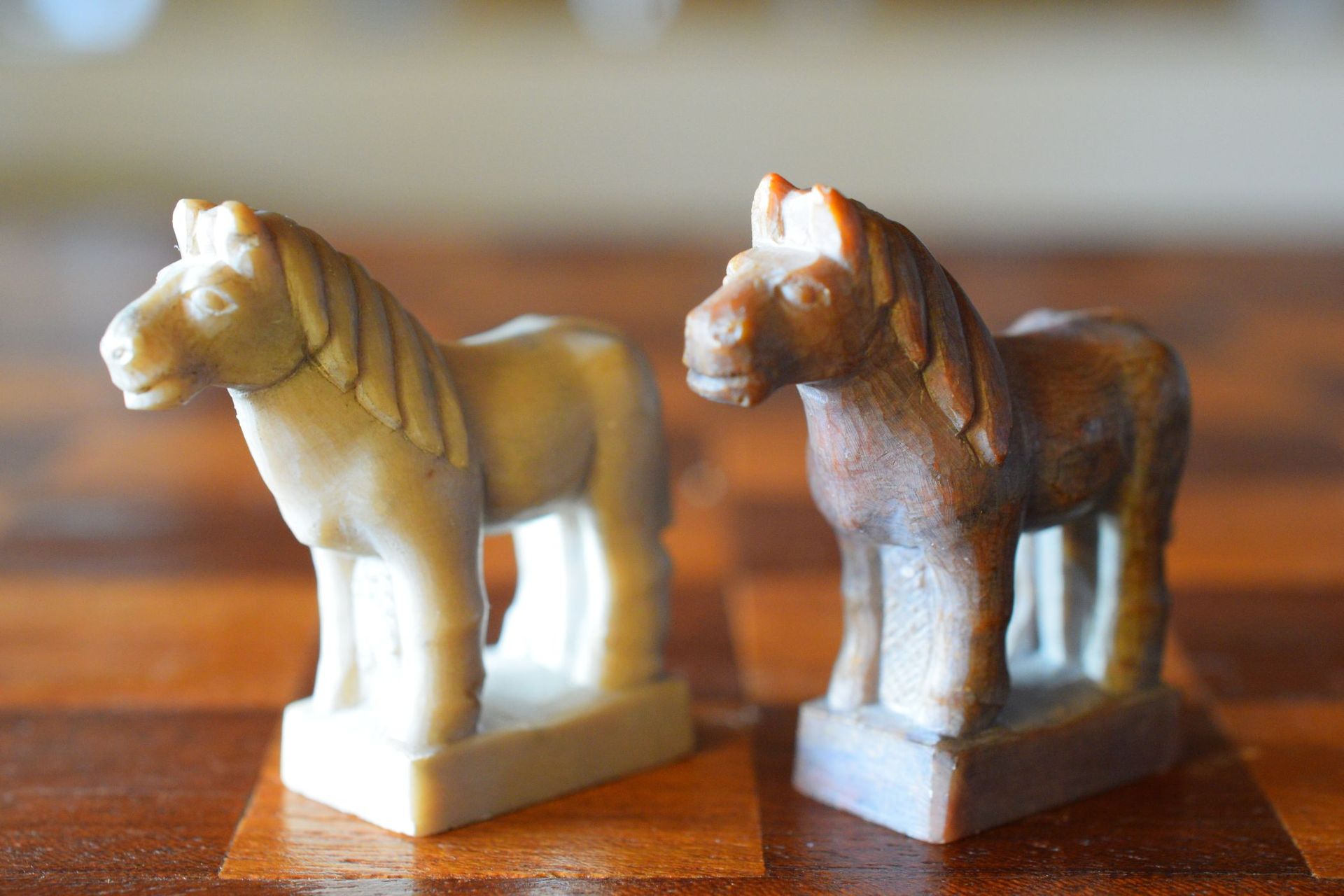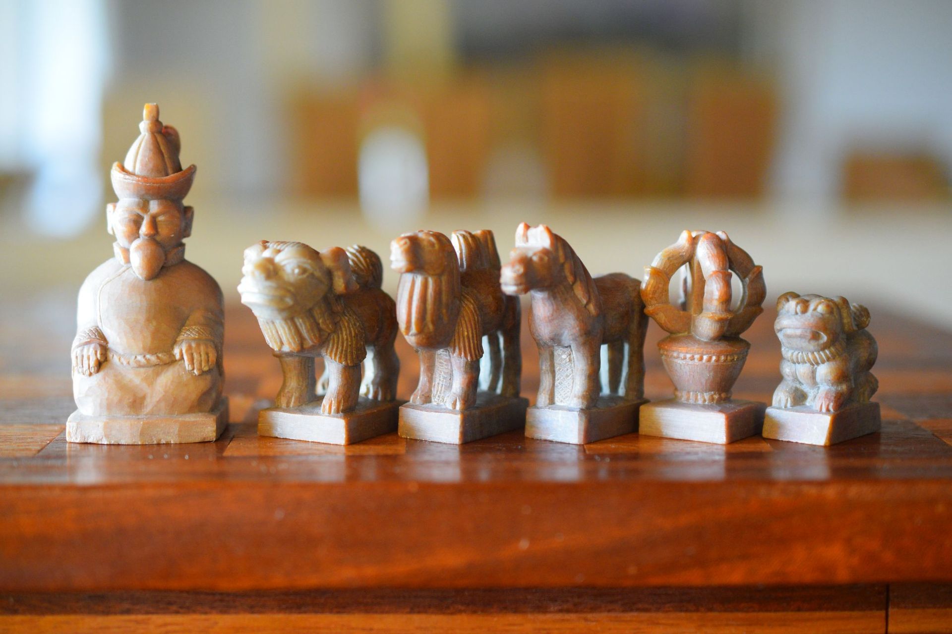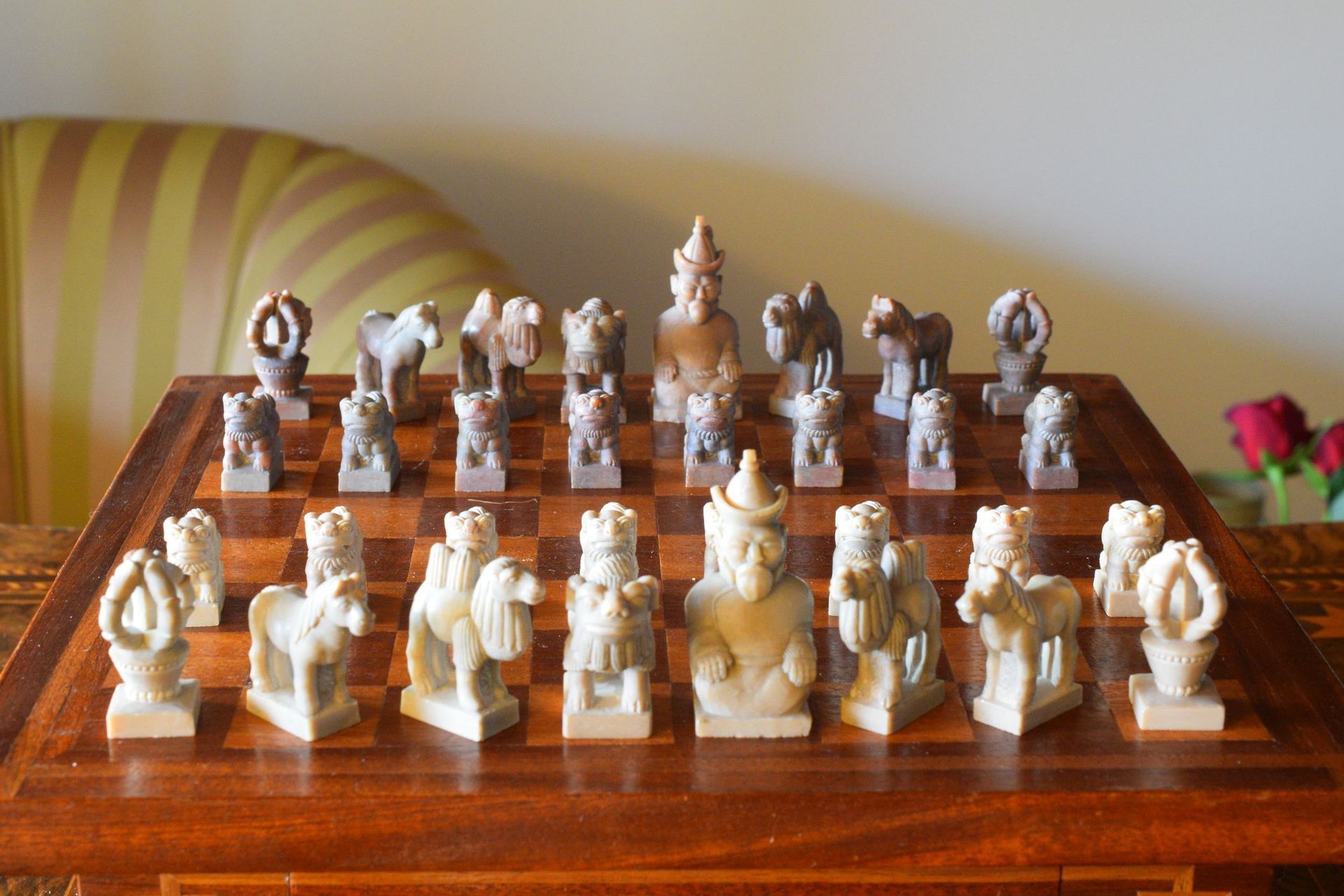 Here is another set that belongs to the category of Mongolian Shatar sets. In this case, it comes from northern Mongolia or southern Siberia, more precisely the Russian Republic of Tuva. The set has a king size of 6 cm and is carved from soapstone in extraordinary quality for a set of this small size. Gareth Williams shows a very similar set in his book ‘Master Pieces’ on pages 110/111, which he describes as follows: ‘Carved from soapstone, the set represents the Soyot tradition with a king shown as a “noyion” or master of the house in the costume of a wealthy Utyankh. The queen is shown as a sacred lion of Chinese legend, the camel and horse are constant features of a Mongolian set, the rook is shown as a symbol of movement, the pawns smaller carvings of the sacred lion.’ The camels used as bishops in this type of sets are always the two-humped Bactrian or Mongolian camels with distinctive fur. The symbols used as rooks in this set are extremely unusual and difficult to describe. As the rooks in the Mongolian chess tradition almost always symbolise movement (e.g. in the form of carts or even trucks), this particular symbol is probably also linked to this notion.