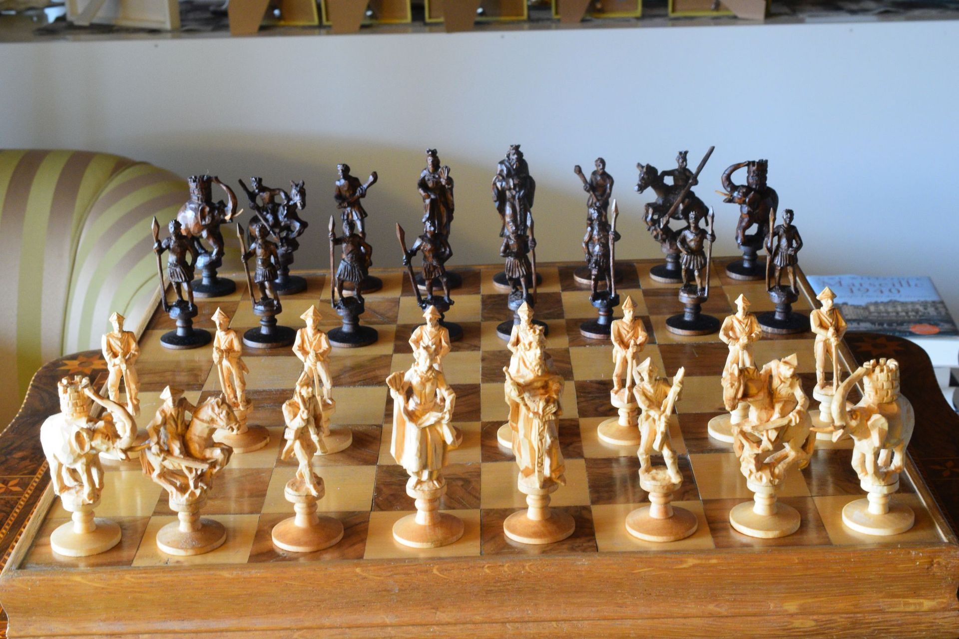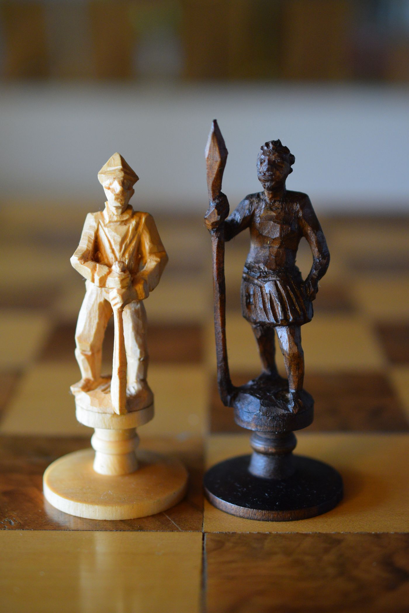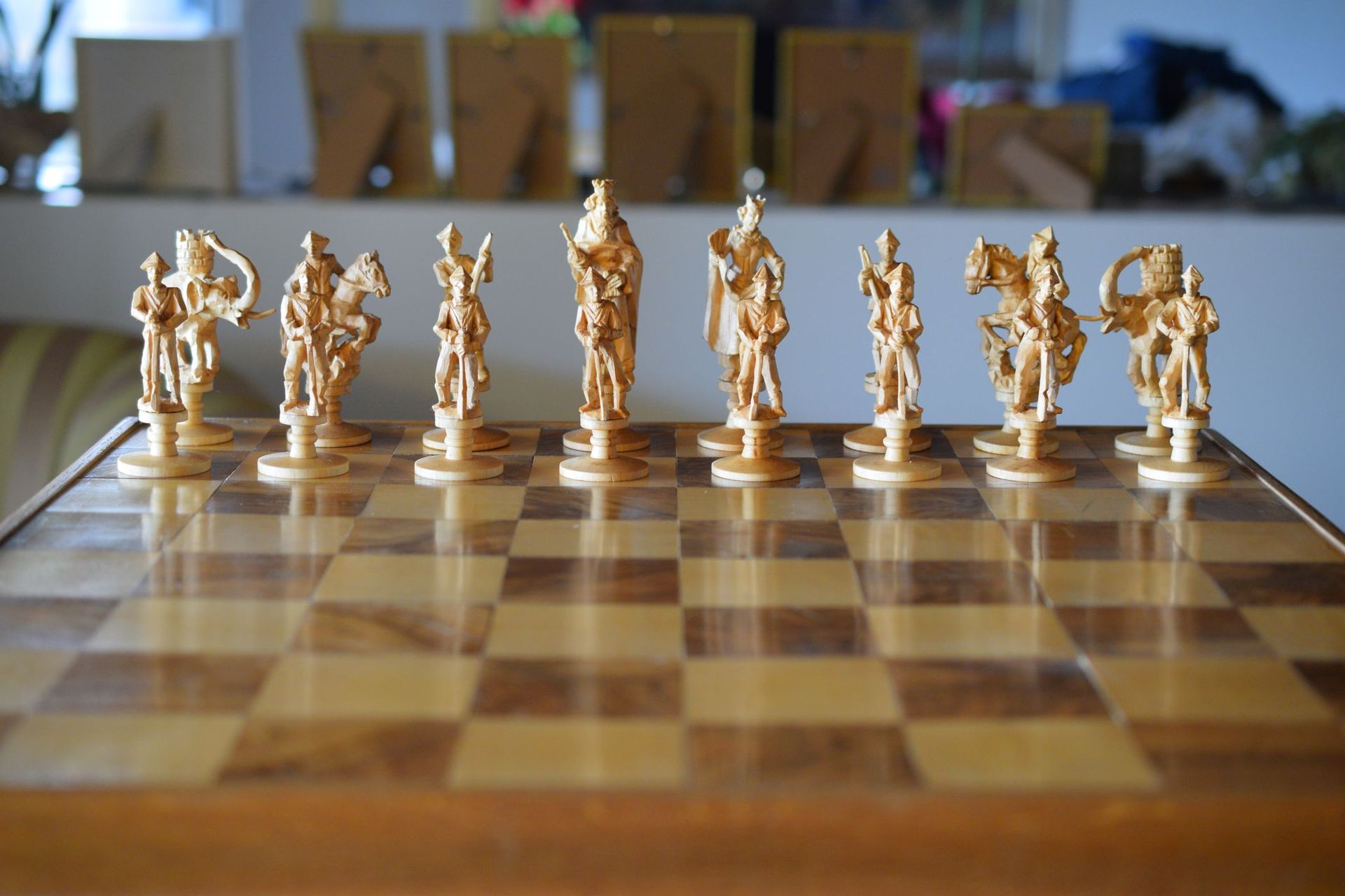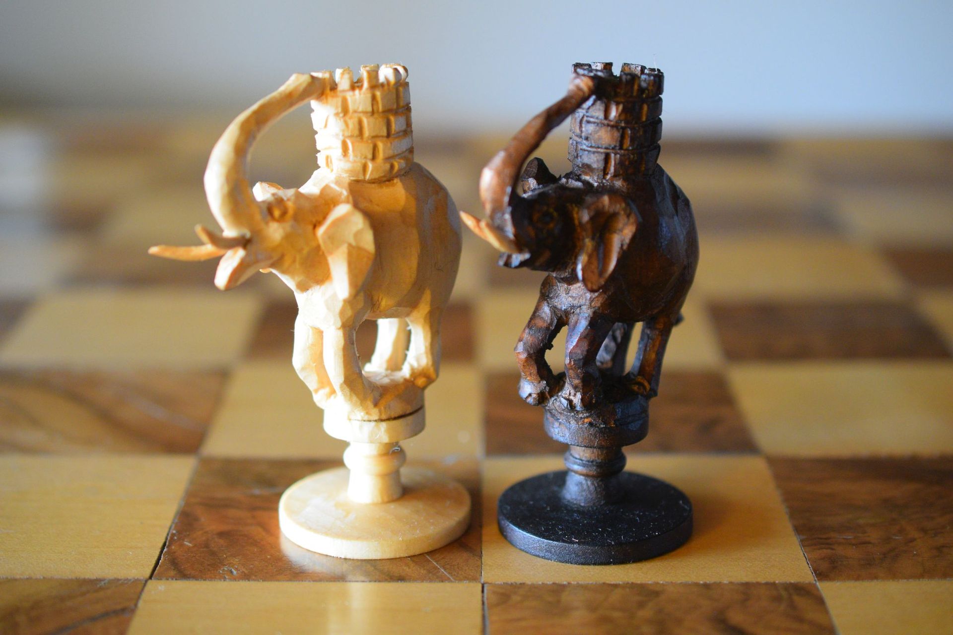 A figural chess set presumably made in Tyrol, Austria in the second half of the 20th century. The pieces with a king size of 11.5 cm were made from pine wood in the traditional folk art style typical for the carving tradition of the Alp Mountains. One side natural, the other side stained in brown. The white pieces as a royal court with mounted warhorses as knights and soldiers armed with rifles as bishops and pawns. The black side with royal king and queen, but the rest of the pieces as wilders armed with spears and clubs. A very unusual, but also very attractive feature of this set are the elephant rooks with long tusks and a turret on their back. All pieces on circular pedestals.