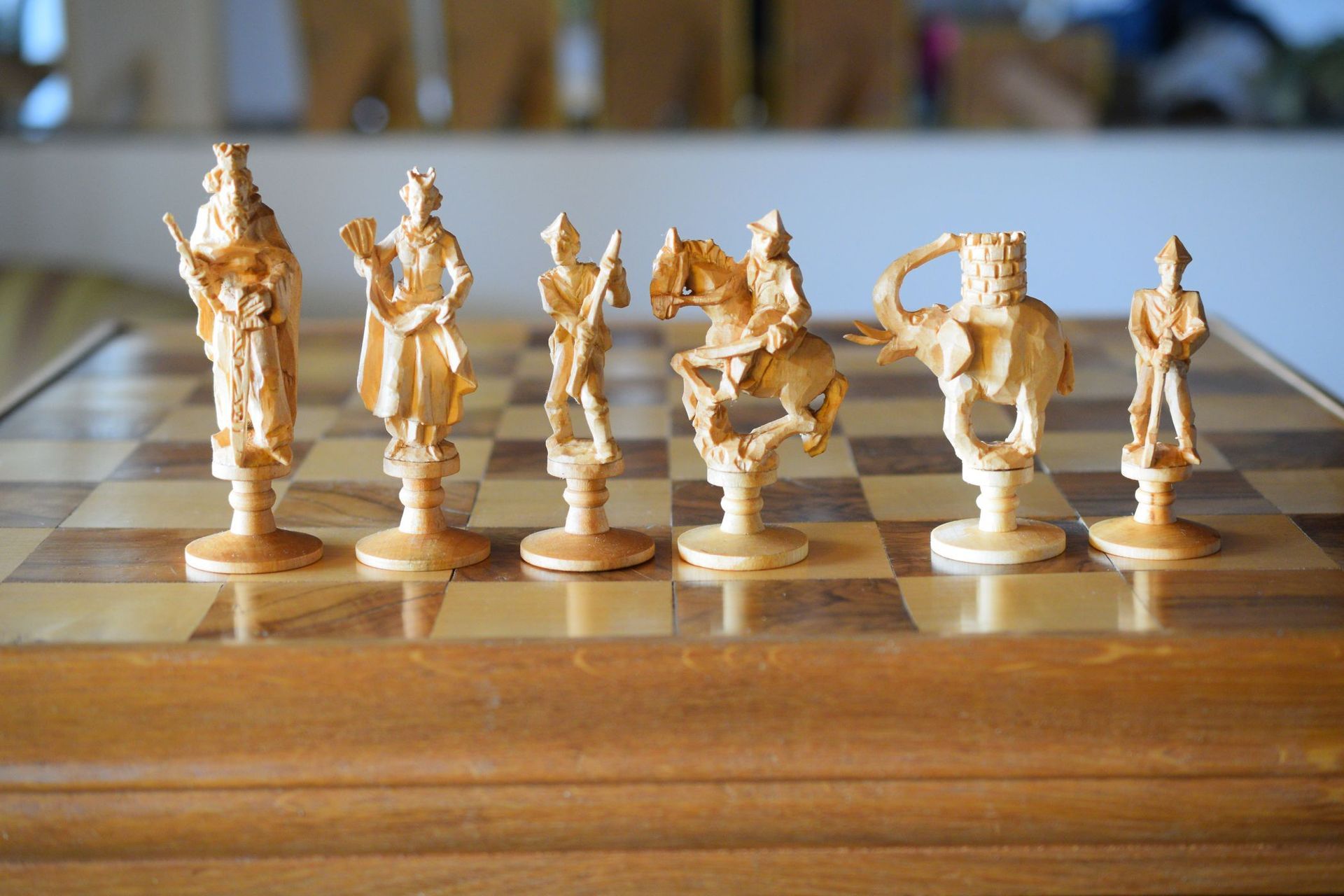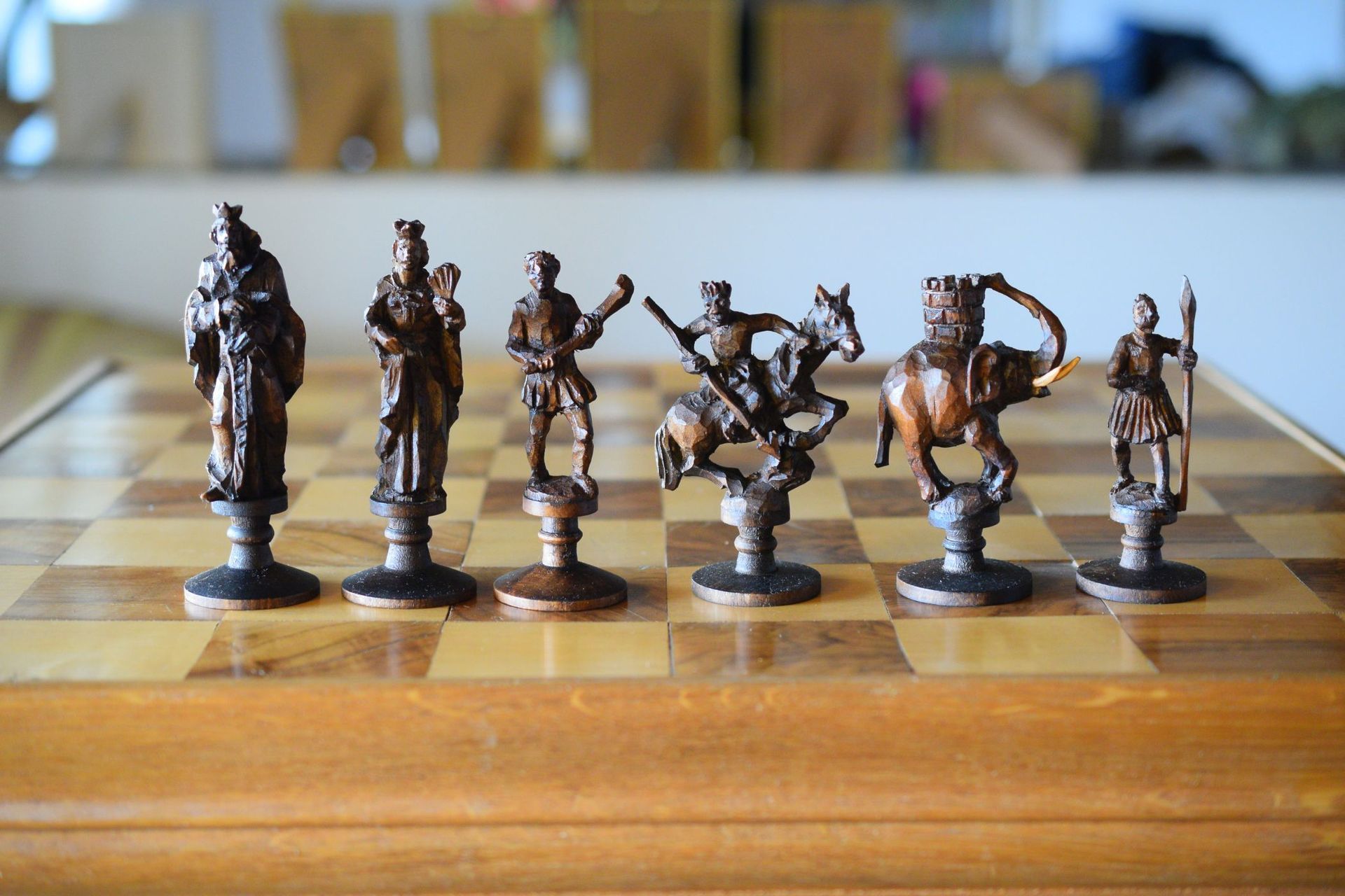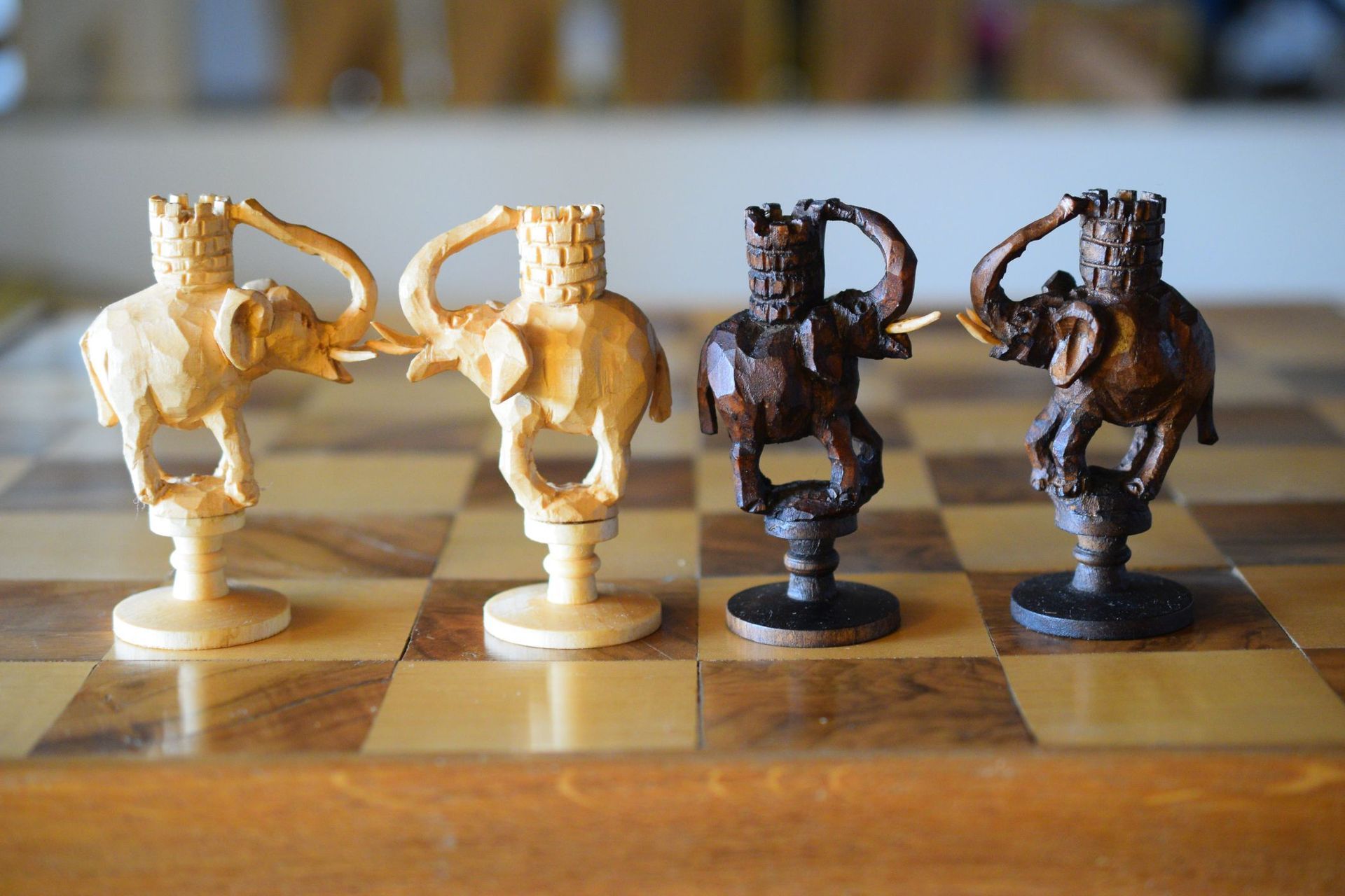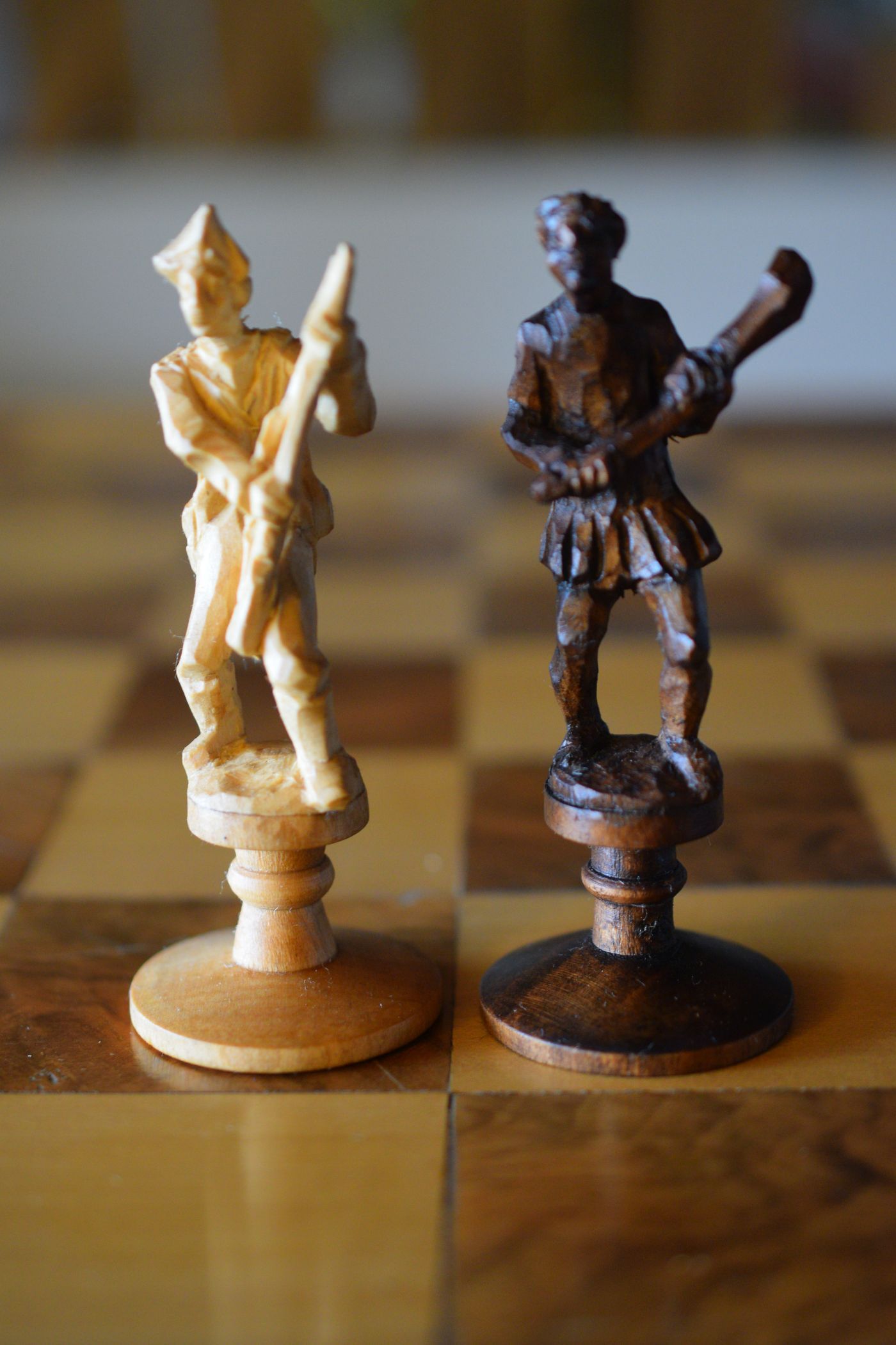 A figural chess set presumably made in Tyrol, Austria in the second half of the 20th century. The pieces with a king size of 11.5 cm were made from pine wood in the traditional folk art style typical for the carving tradition of the Alp Mountains. One side natural, the other side stained in brown. The white pieces as a royal court with mounted warhorses as knights and soldiers armed with rifles as bishops and pawns. The black side with royal king and queen, but the rest of the pieces as wilders armed with spears and clubs. A very unusual, but also very attractive feature of this set are the elephant rooks with long tusks and a turret on their back. All pieces on circular pedestals.