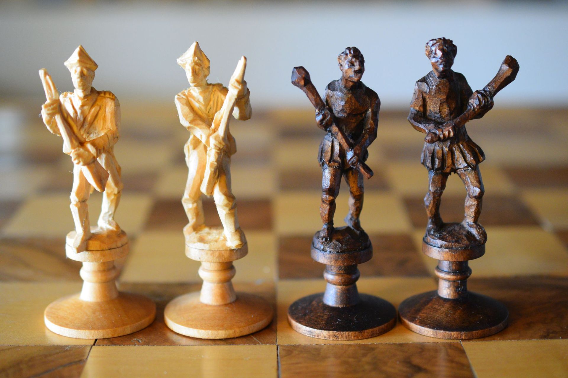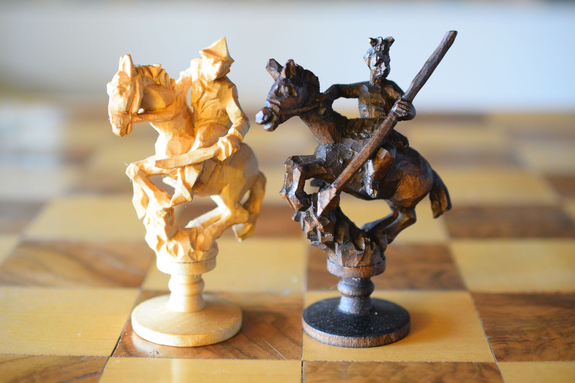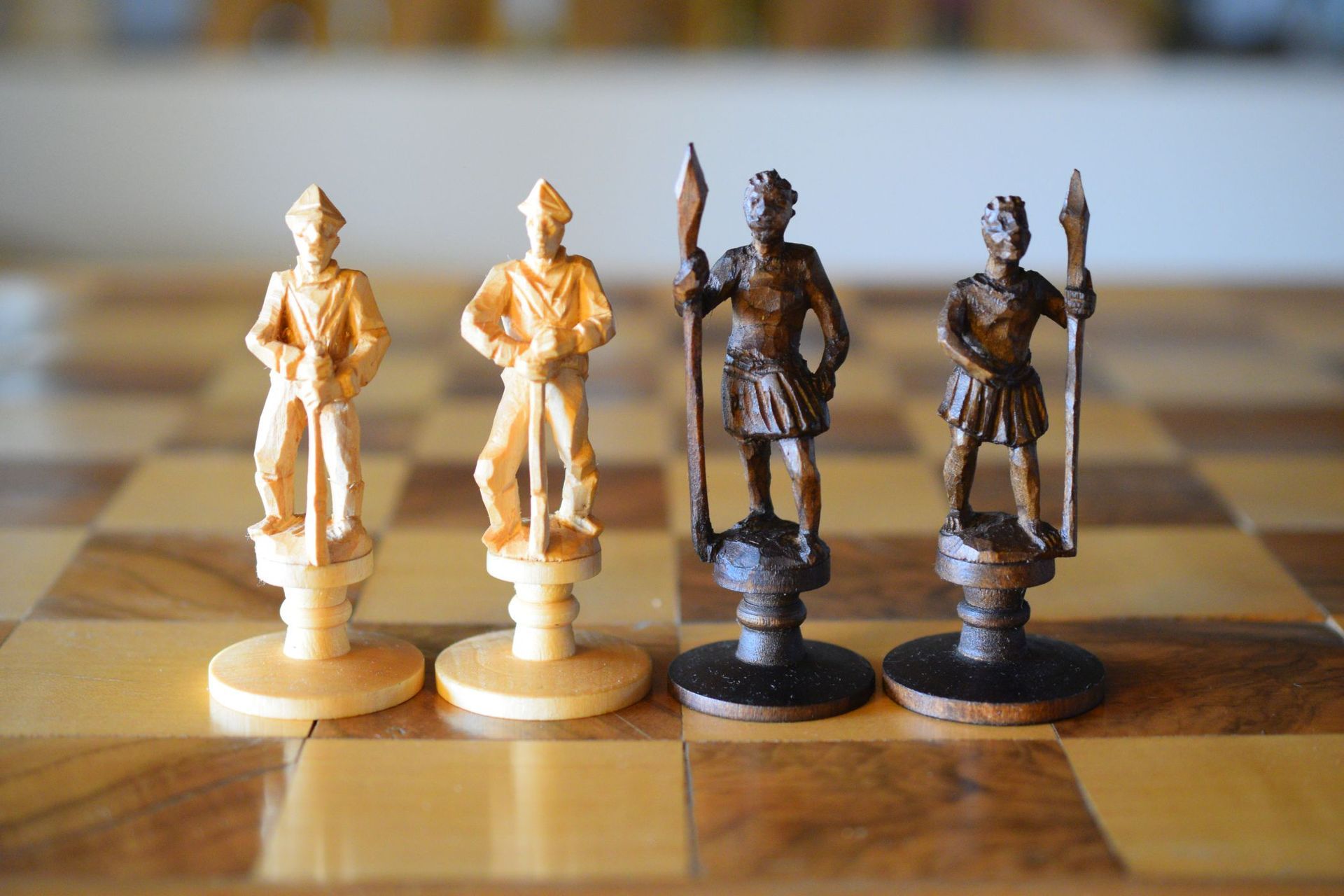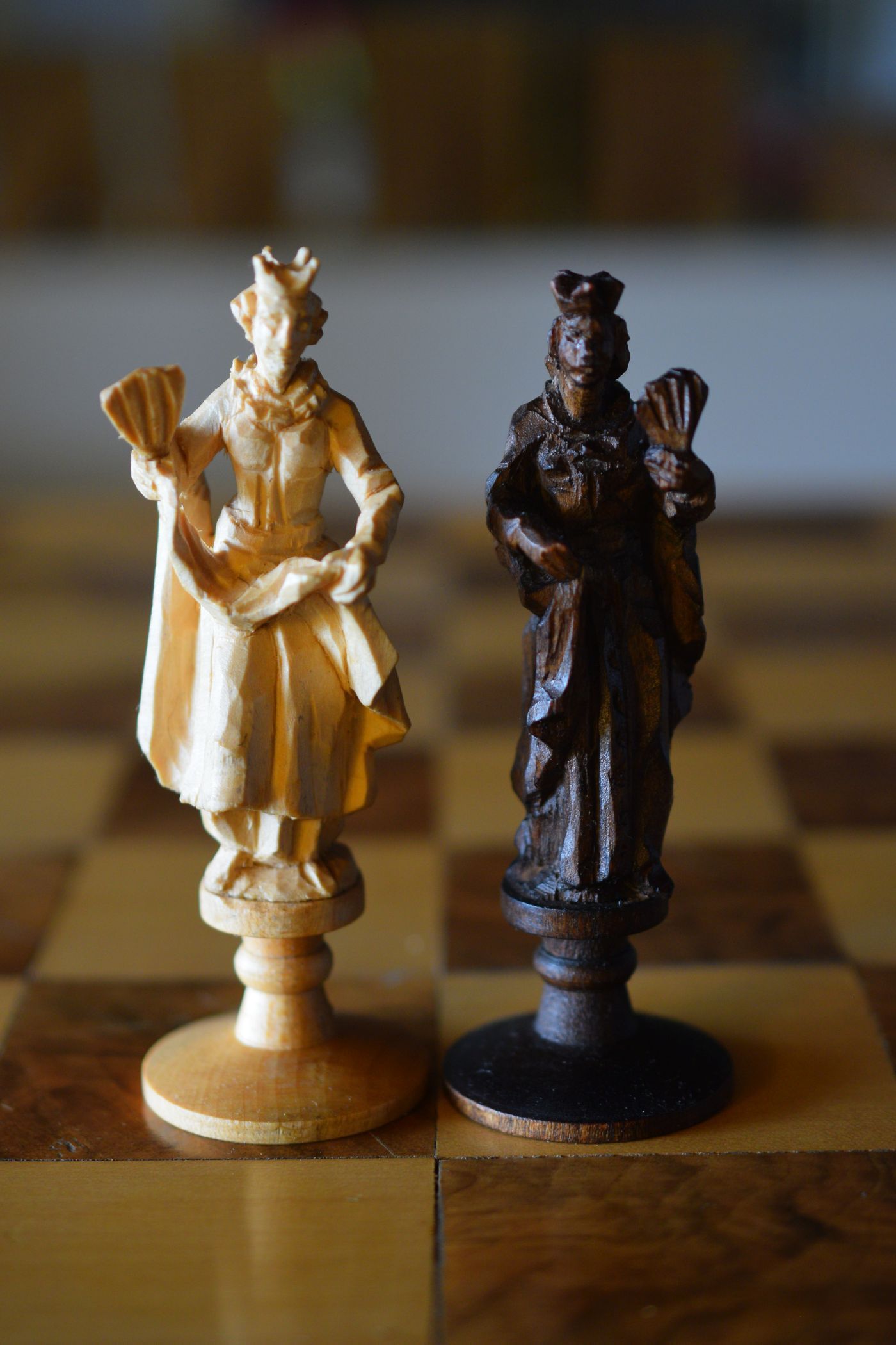 A figural chess set presumably made in Tyrol, Austria in the second half of the 20th century. The pieces with a king size of 11.5 cm were made from pine wood in the traditional folk art style typical for the carving tradition of the Alp Mountains. One side natural, the other side stained in brown. The white pieces as a royal court with mounted warhorses as knights and soldiers armed with rifles as bishops and pawns. The black side with royal king and queen, but the rest of the pieces as wilders armed with spears and clubs. A very unusual, but also very attractive feature of this set are the elephant rooks with long tusks and a turret on their back. All pieces on circular pedestals.