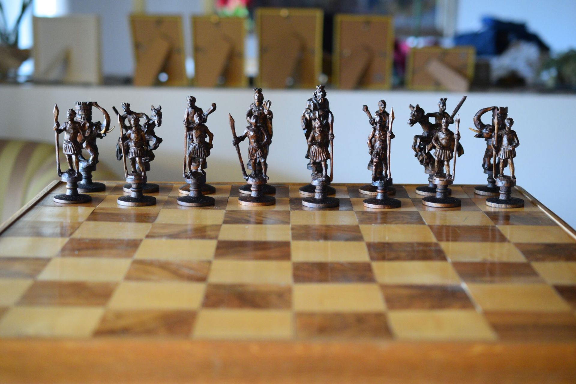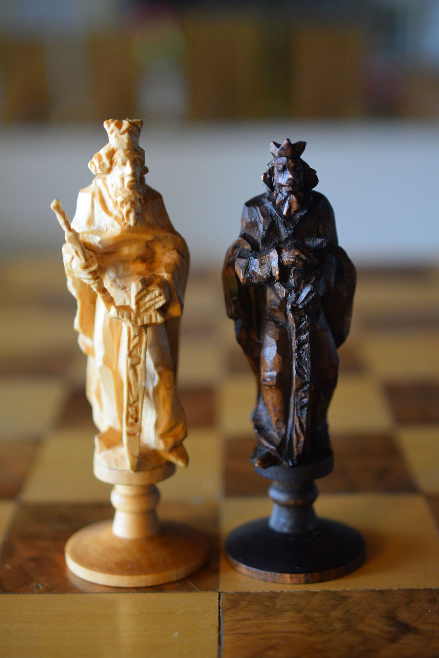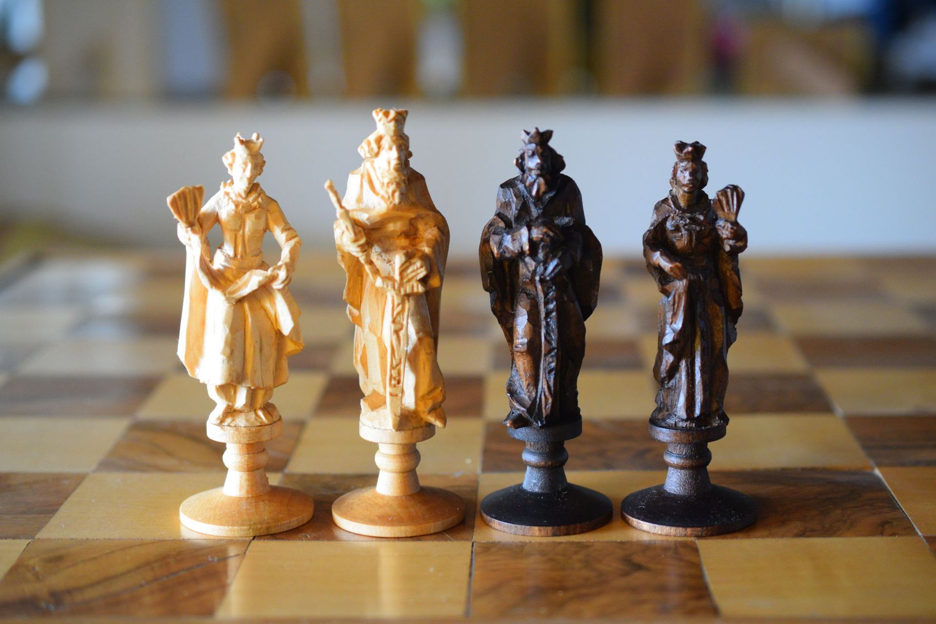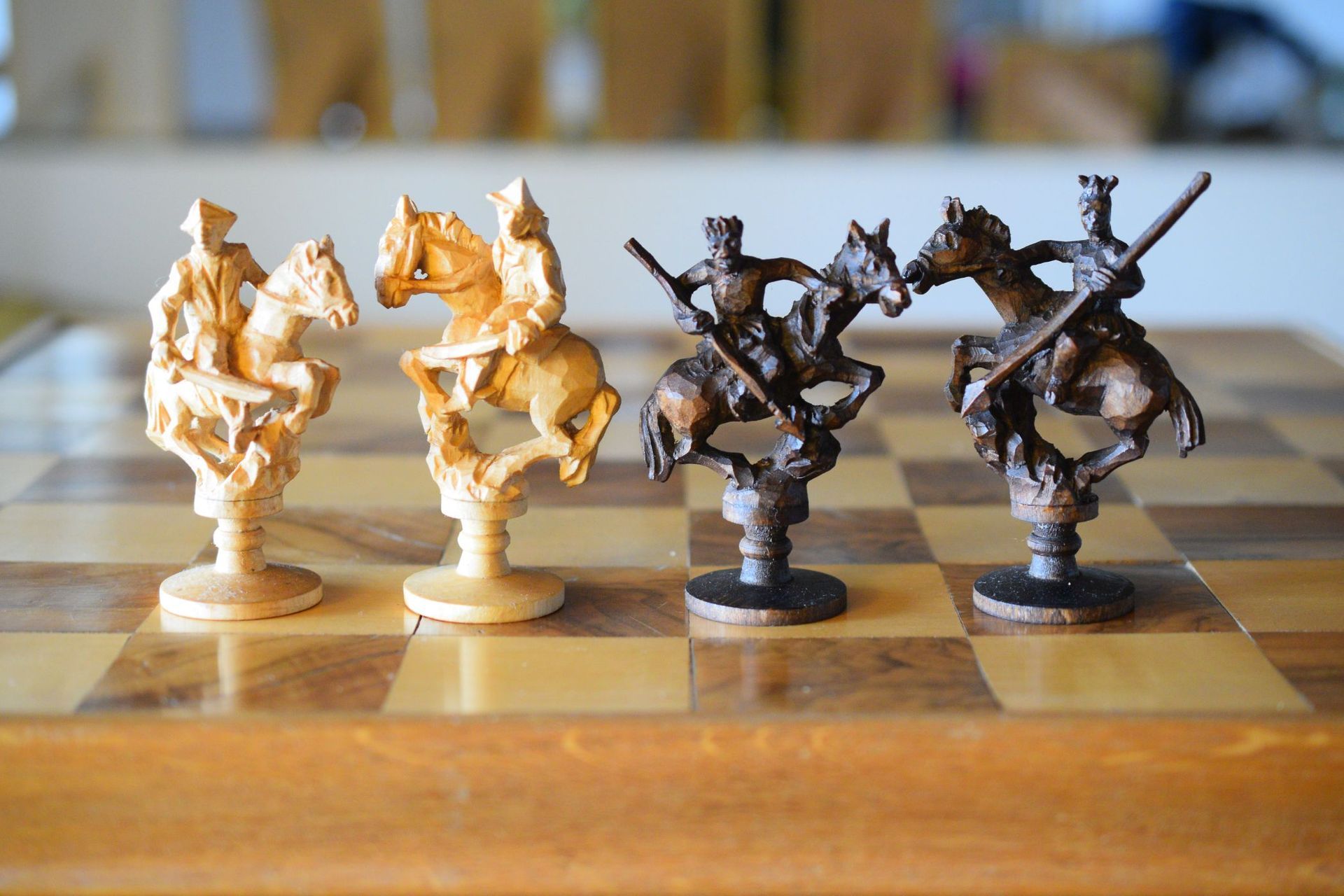 A figural chess set presumably made in Tyrol, Austria in the second half of the 20th century. The pieces with a king size of 11.5 cm were made from pine wood in the traditional folk art style typical for the carving tradition of the Alp Mountains. One side natural, the other side stained in brown. The white pieces as a royal court with mounted warhorses as knights and soldiers armed with rifles as bishops and pawns. The black side with royal king and queen, but the rest of the pieces as wilders armed with spears and clubs. A very unusual, but also very attractive feature of this set are the elephant rooks with long tusks and a turret on their back. All pieces on circular pedestals.